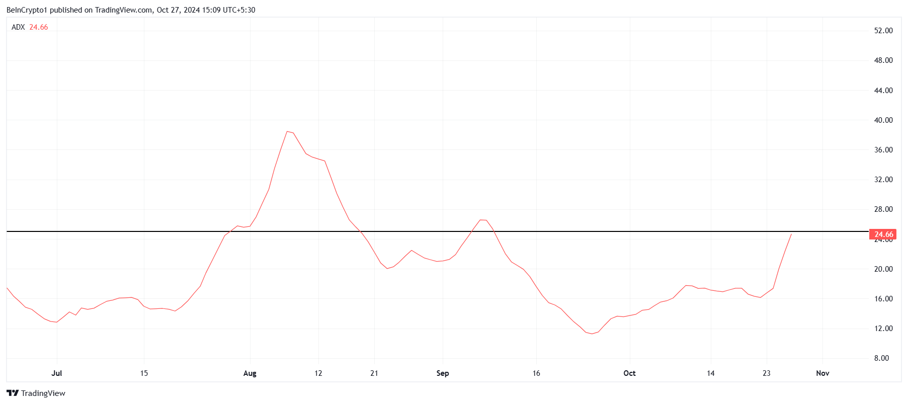 マクロトレンドを分析すると、トンコインの全体的な勢いは依然として弱気です。現在の平均方向指数(ADX)は25.0の重要な閾値の直下にあります。この閾値はトレンドの強さを示すもので、ADXが25.0を超えると、活発なトレンドの強化を示します。トンコインにとって、これは弱気の勢いが強まることを意味します。