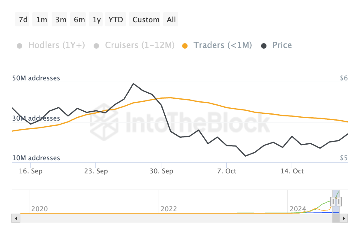 トンコインの短期保有者(STH)も保有期間を短縮しており、下落リスクを増大させています。IntoTheBlockによると、彼らの保有期間は過去1か月で7%減少しました。
