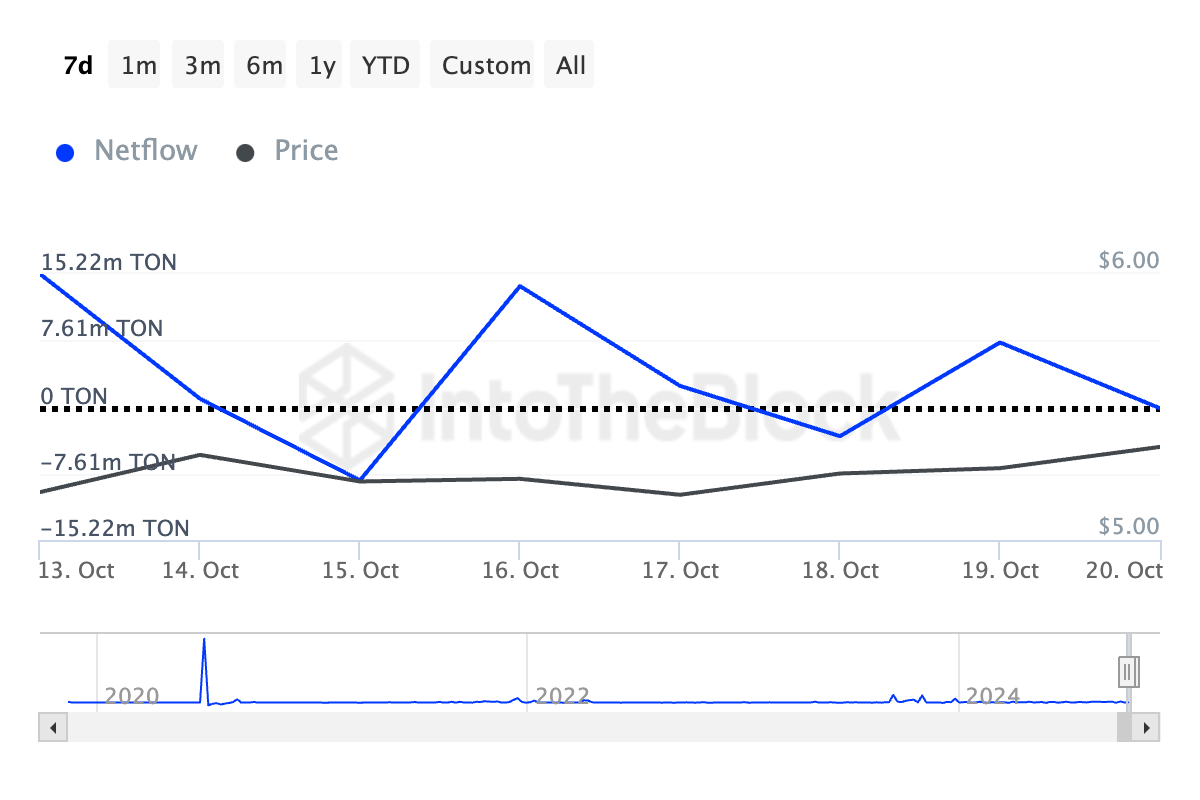 過去1週間で、トンコインの大口保有者の純流出量は115%減少しましたが、価格は1%上昇しました。大口保有者、つまり資産の流通供給量の0.1%以上を保有するアドレスは、市場の動向を示す重要な指標です。彼らの純流出量は、一定期間に購入と売却の差を示し、市場のセンチメントを提供することができます。