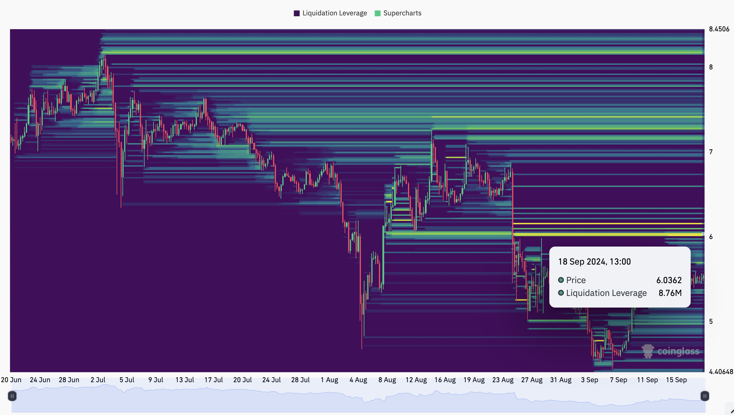 トンコインの3か月の清算ヒートマップも、潜在的な価格上昇を示しています。なじみのない方のために説明すると、ヒートマップは大規模な清算が発生する可能性のある価格レベルを強調しています。色が紫から黄色に変わるときに現れる高い流動性濃度は、これらのレベルに向かって価格が動く可能性があることを示唆しています。