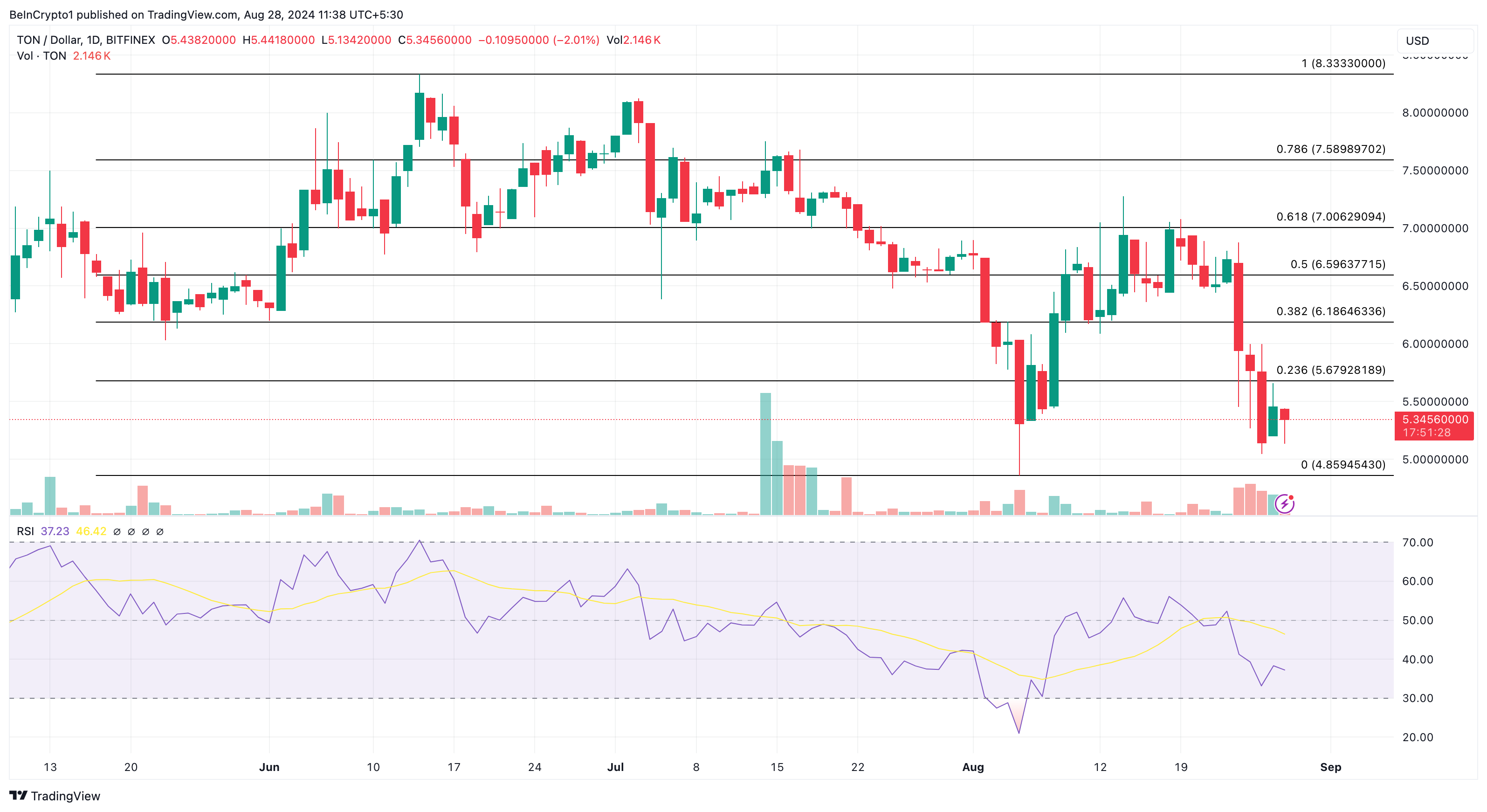 日足チャートでは、TONの価格はかなりの圧力下にある。例えば、Telegramコインは昨日6ドルに到達しようとしたが、この記事を書いている時点では5.32ドルまで下落している。
