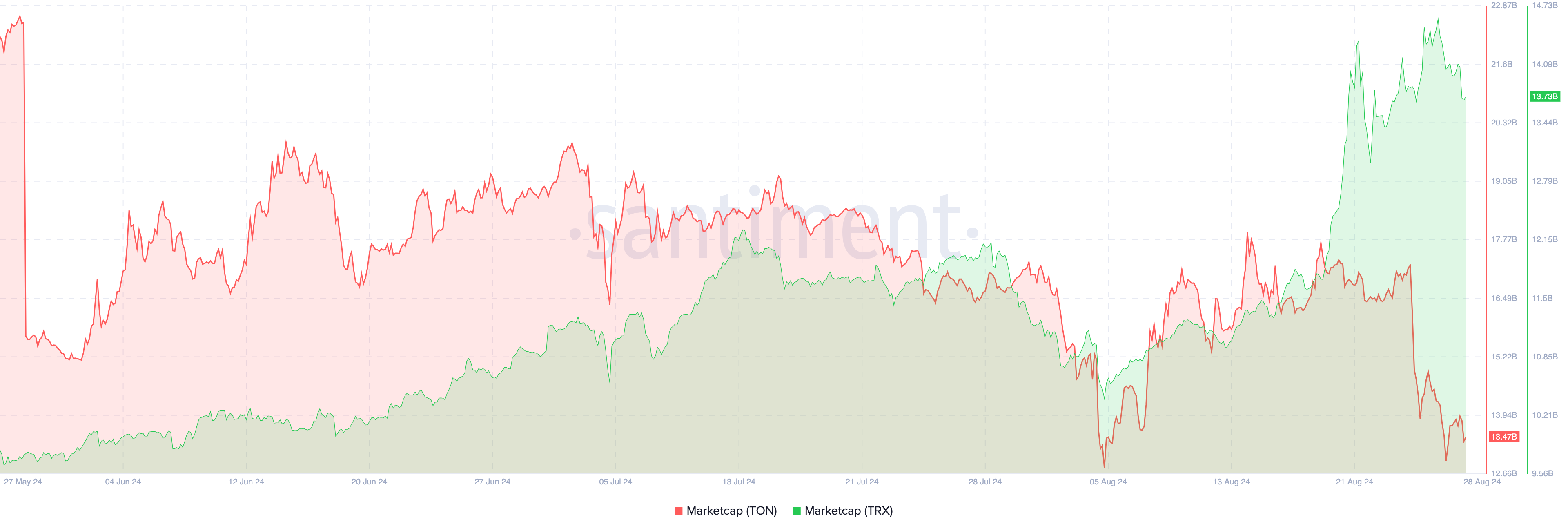 馴染みのない方のために説明しておくと、時価総額は流通供給量に資産価格を乗じて算出される。したがって、TONの価格下落はこの下落に直接寄与している。対照的に、トロン(TRX)はより有利な立場にある。