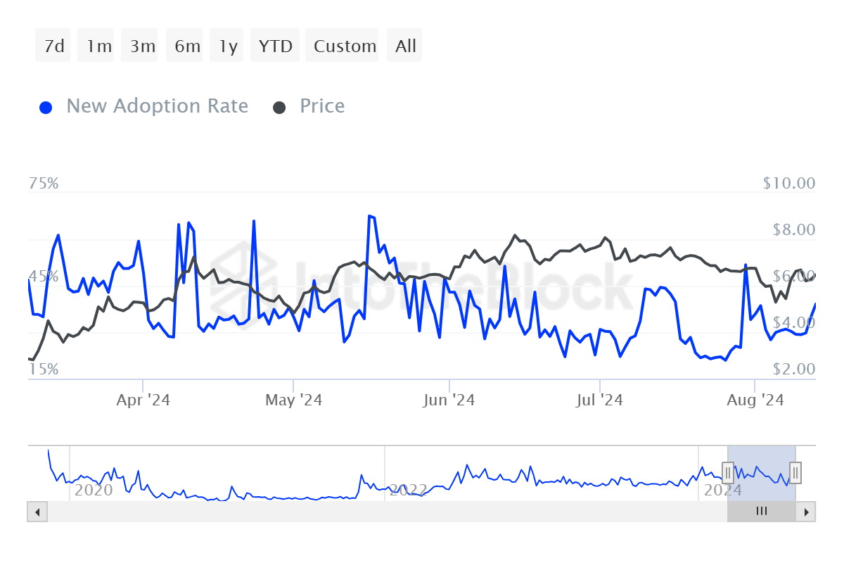 DAAダイバージェンスに加えて、Toncoinの採用率は 顕著な回復を経験している 。採用率は平均28%まで回復しており、プロジェクトが支持を集め、より多くのユーザーを引き付けていることを反映している。この採用率の増加は、アセットの市場での地位と長期的な可能性をさらに強化する可能性がある。