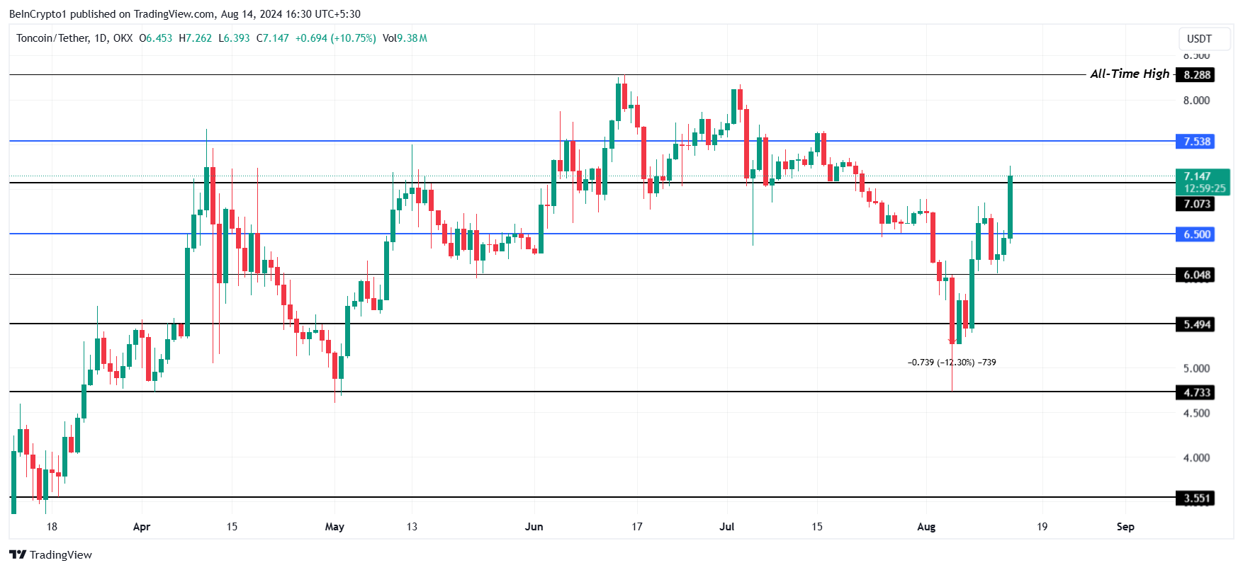 トンコインの価格は現在$7.14で取引されており、$7.07のレジスタンスの上でクローズしようとしている。このレベルがサポートに反転すれば、さらなる上昇が可能になり、TONを7.53ドルまで押し上げる可能性がある。