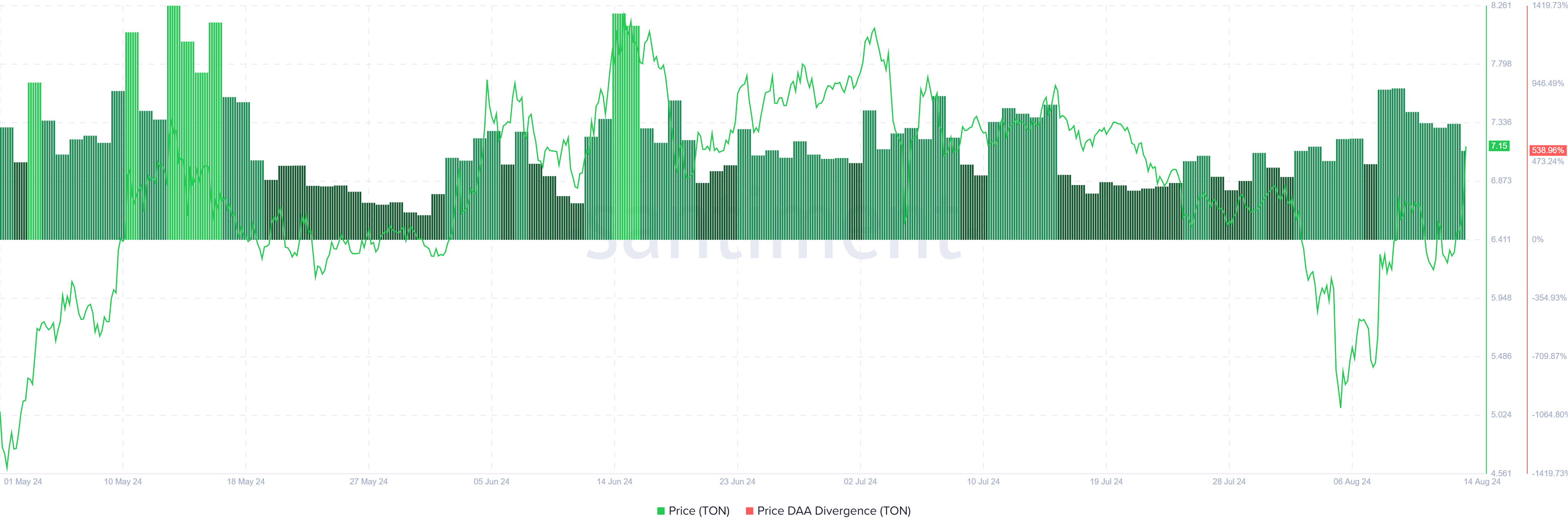 トンコインの価格は過去1日で10.5%上昇し、前週の上昇に追加された。この一貫した上昇は、DAA(デイリーアクティブアドレス)のダイバージェンスによる買いシグナルを誘発した。