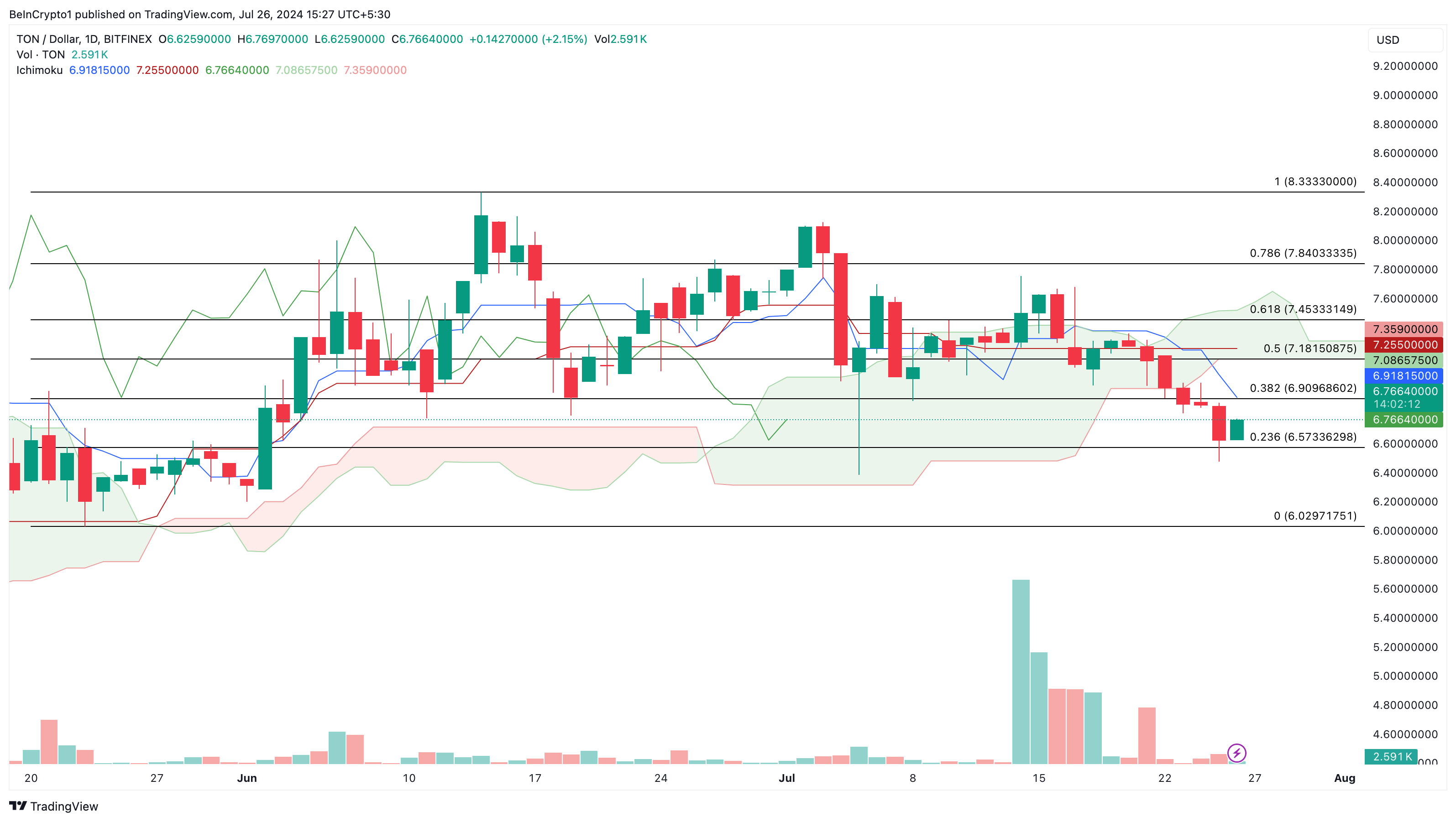 しかし、TONの場合、雲は価格の上にあり、弱気の勢いを示している。以下のチャートから、トンコインの価格はフィボナッチリトレースメント23.6%の位置である6.57ドルまで下落する可能性がある。
