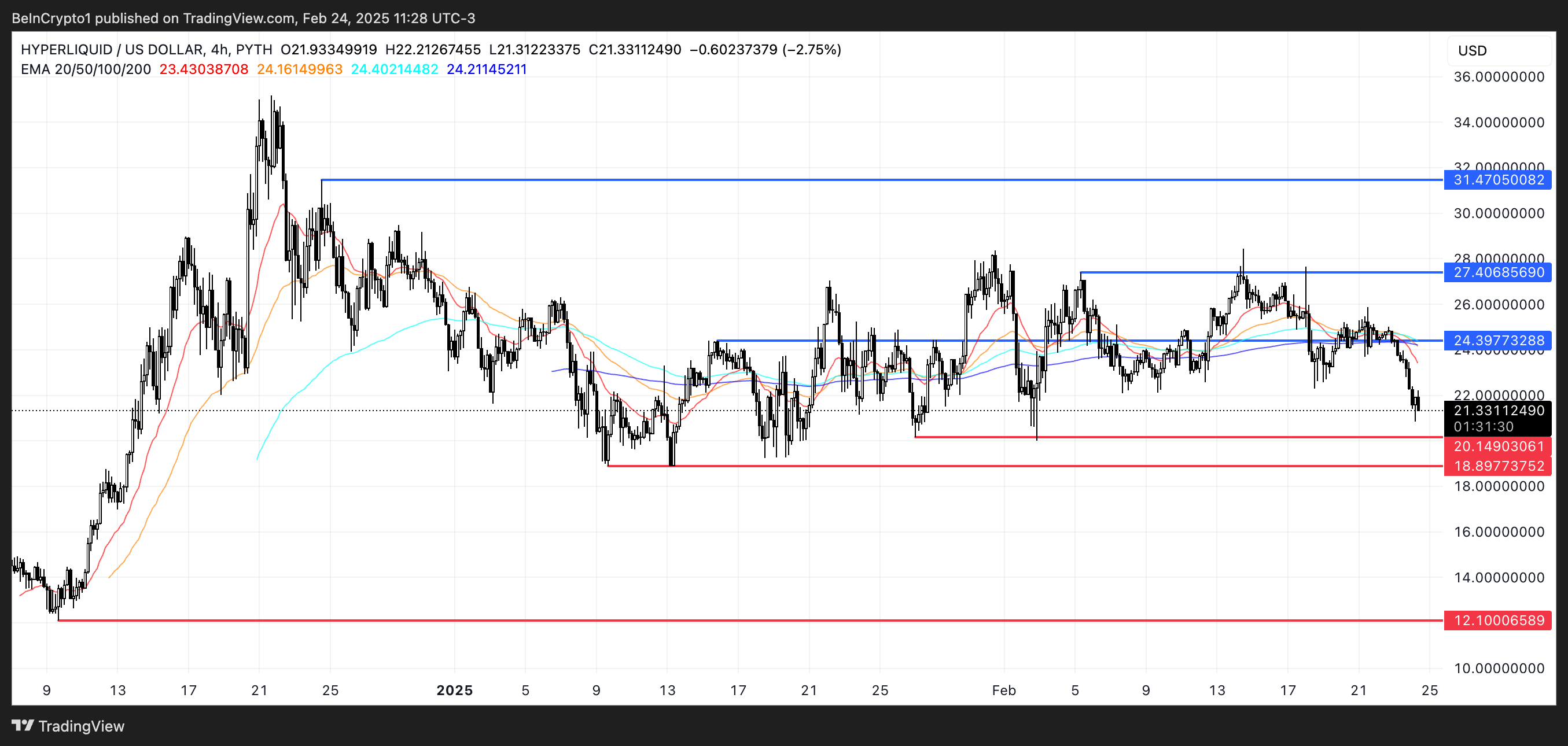 逆に、感情が逆転すれば、ハイパーリキッドは24.3ドルの抵抗をテストする可能性がある。それを超えると27.4ドルに達する可能性がある。