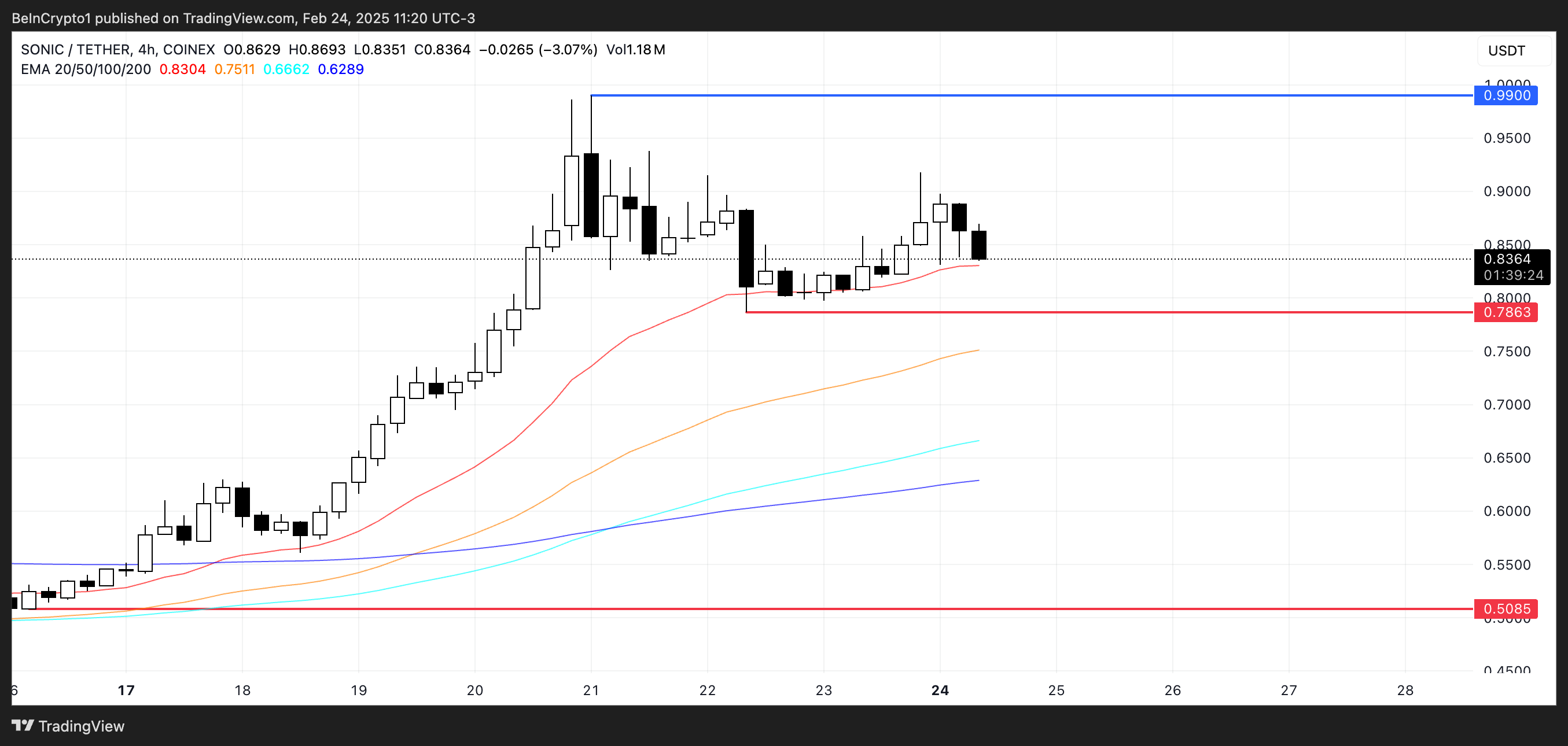 ソニックは、過去数週間でトレンドとなっている。強い上昇傾向を示している。過去7日間で約40%、過去30日間で55%上昇し、時価総額は24億ドルに達した。2月21日には0.97ドルに達し、過去最高値の一つとなった。