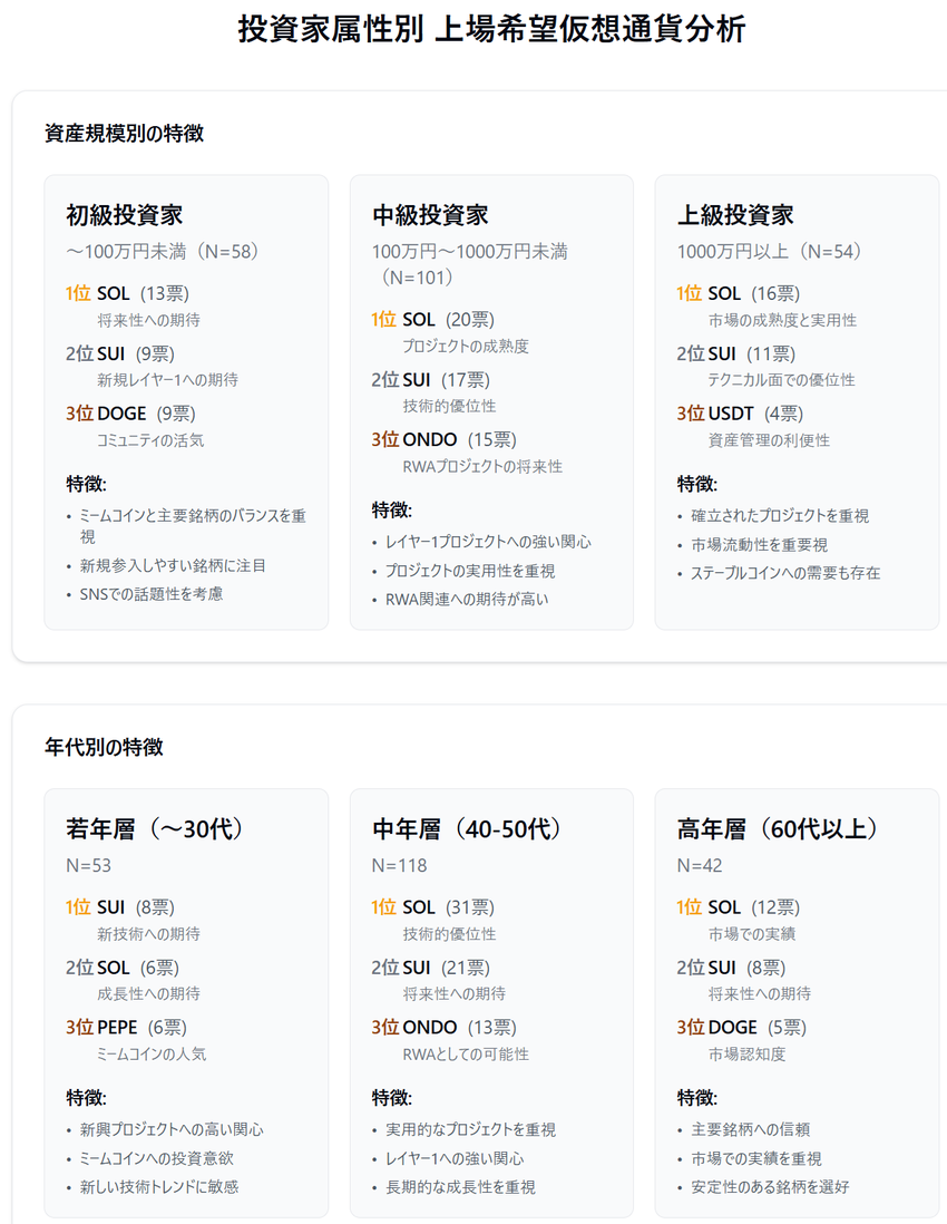同社の調査によれば、投資家の資産規模や年代によって、上場を期待する暗号資産銘柄に明確な傾向の違いが見られる。