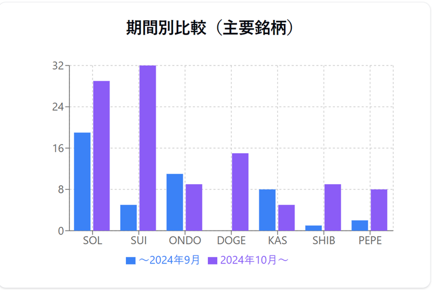 同調査期間(2024年7月~2025年2月)を前期と後期で比較すると、市場環境の変化を反映した興味深い傾向が見られた。SOLは後半期間で支持を大きく伸ばし(19件→29件)、SUIも同様の上昇傾向(5件→32件)が見られた。