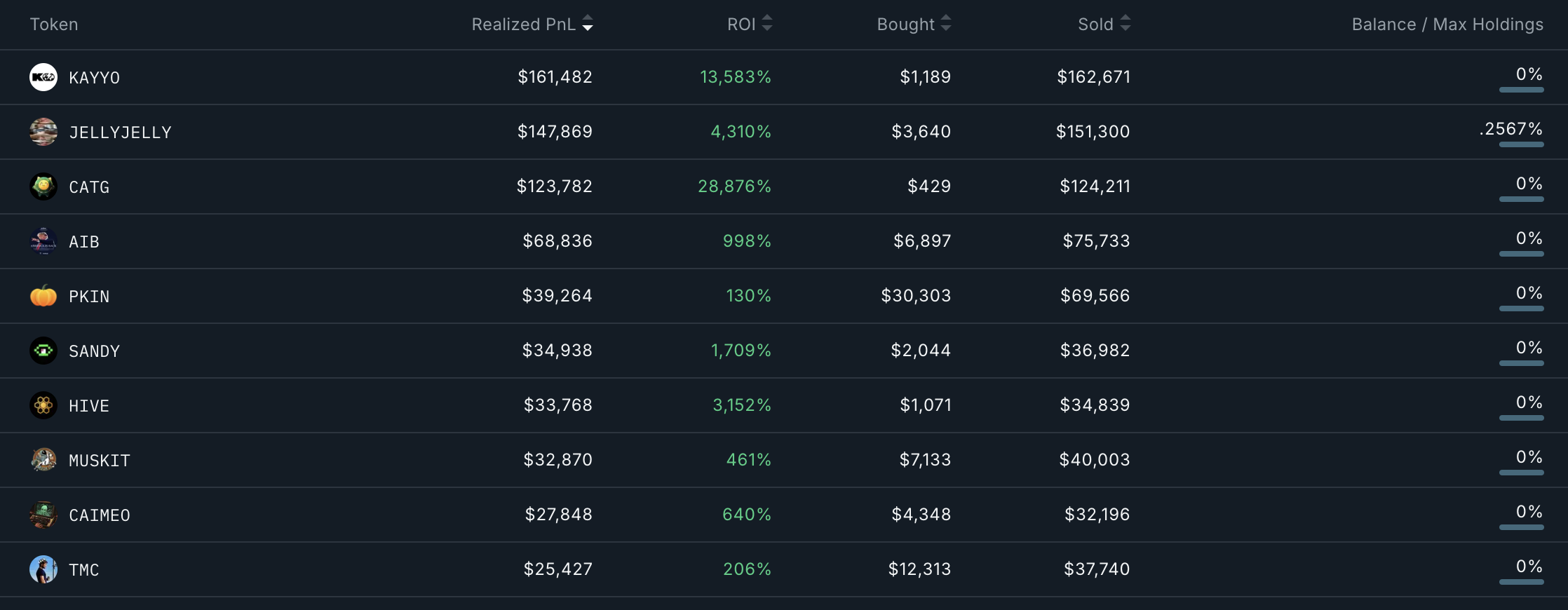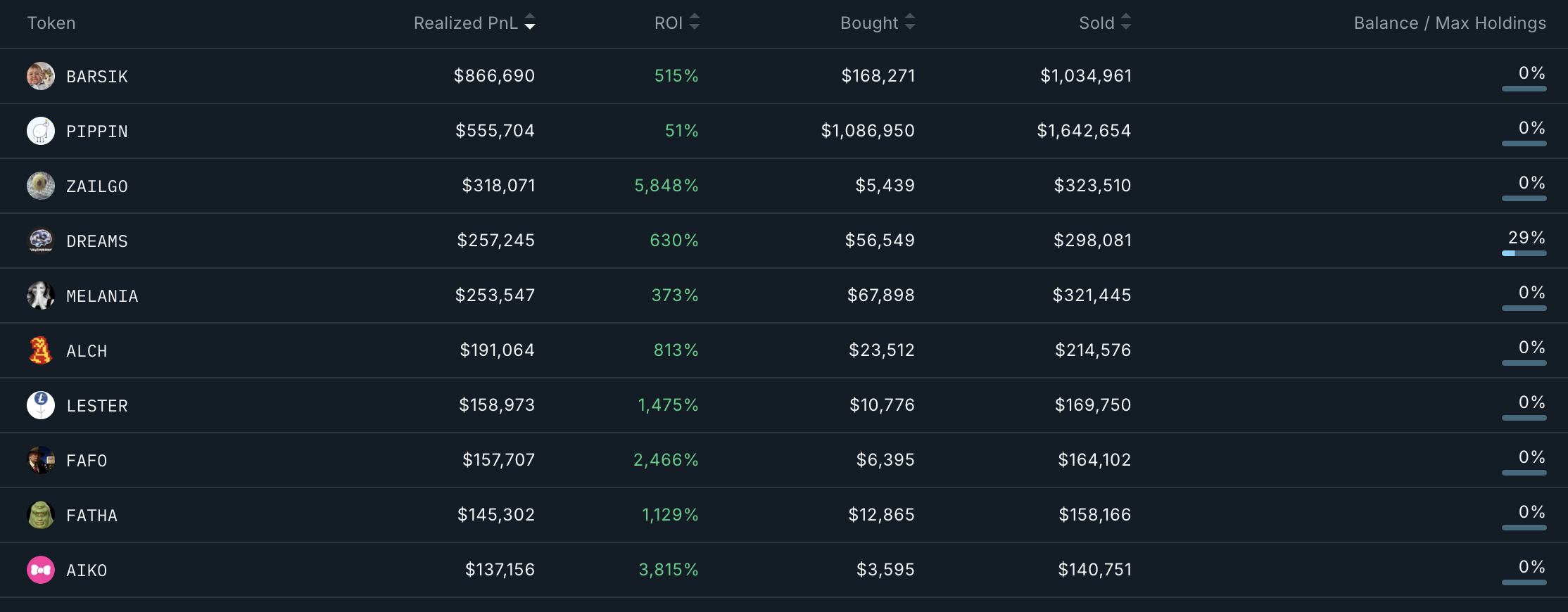 このウォレットはまた、13種類のトークンで10万ドル以上の実現PnLを達成し、11種類のトークンで1000%以上のリターンを記録している。