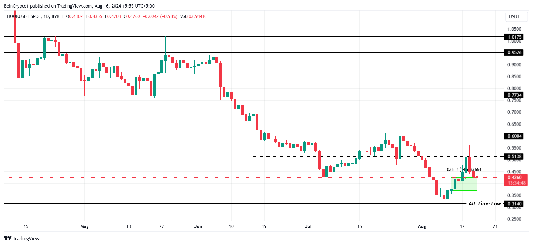 しかし、見たところ、0.513ドルの突破に失敗したことで、0.314ドルの重要なサポートフロアのテストにつながる可能性がある。このラインはHOOKの史上最安値でもあり、これを下回る下落は強気テーゼを無効にするだろう。