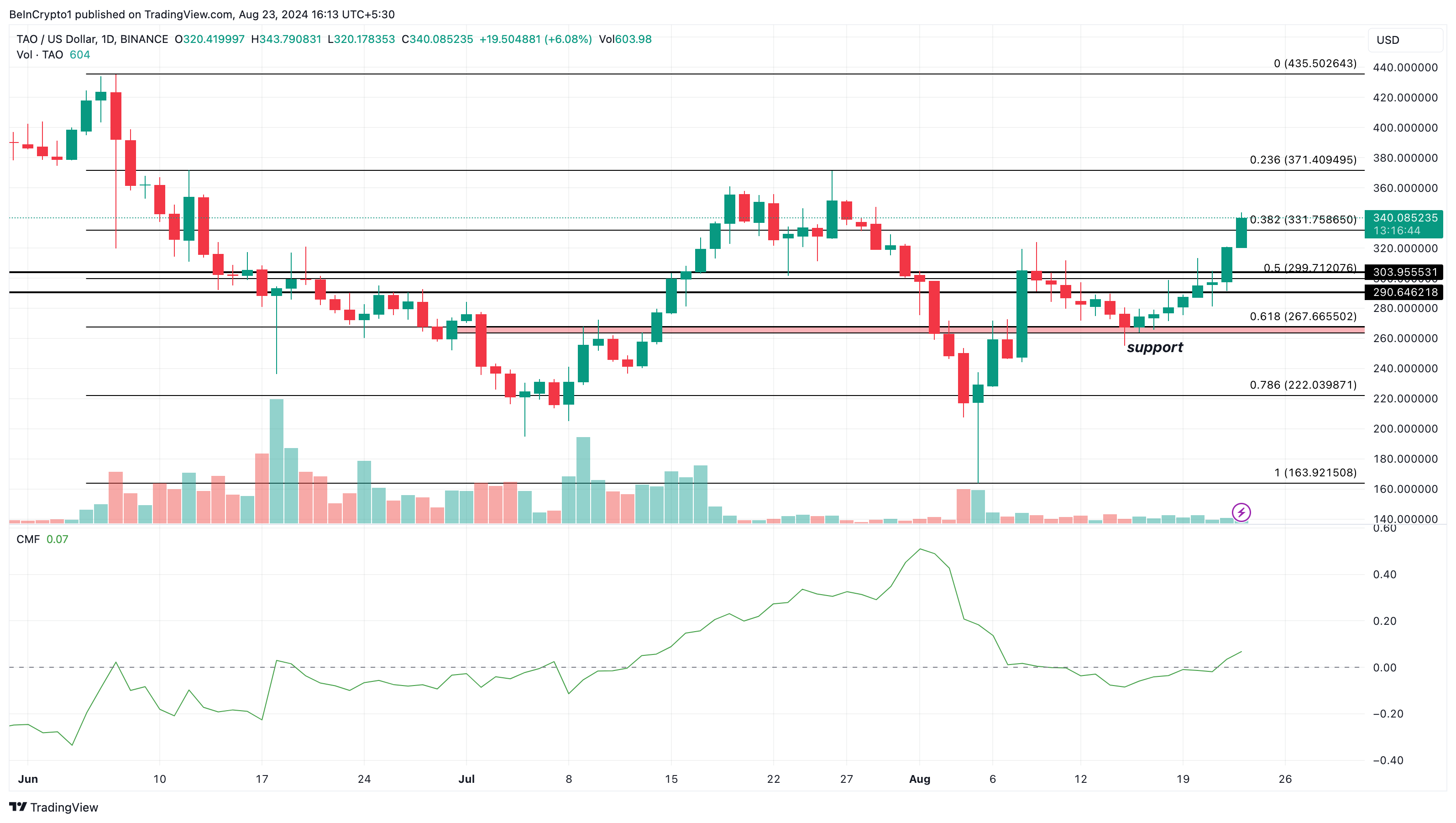 現在、チャイキン・マネー フロー(CMF)インジケータはマイナス圏を脱し、累積が分配を上回っ ていることを示唆している。累積が続けば、週末が終わる前にTAOは371.40ドルに達する可能性がある。