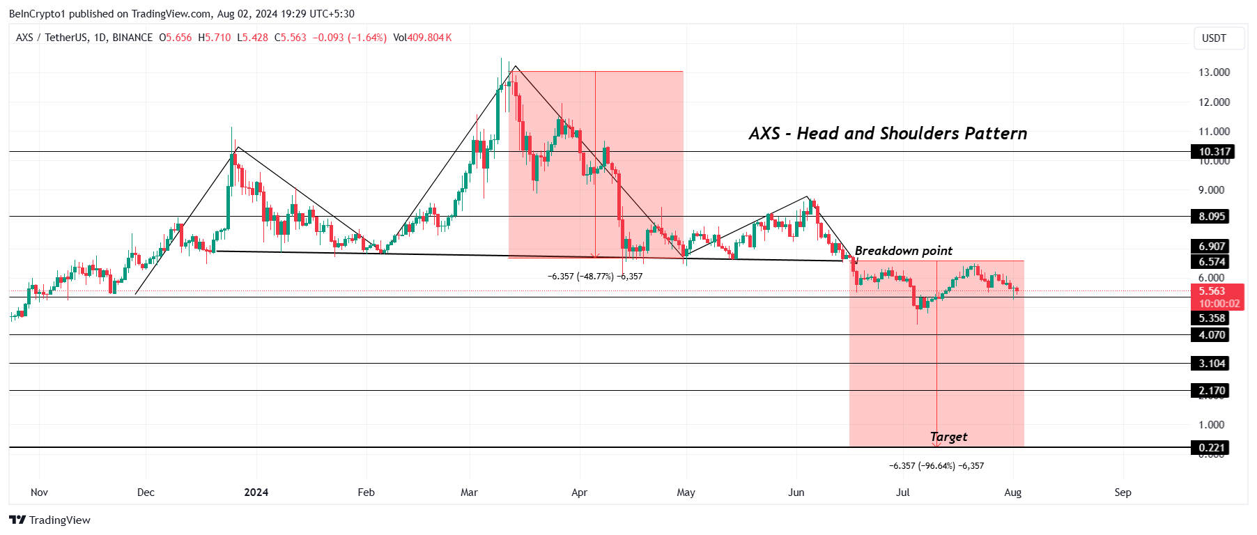 これはネットワークにとって大きなアップグレードであり、その効果はAXS価格に現れている。このアルトコインは現在、ヘッドアンドショルダーパターンの形成により、潜在的なドローダウンに直面している。