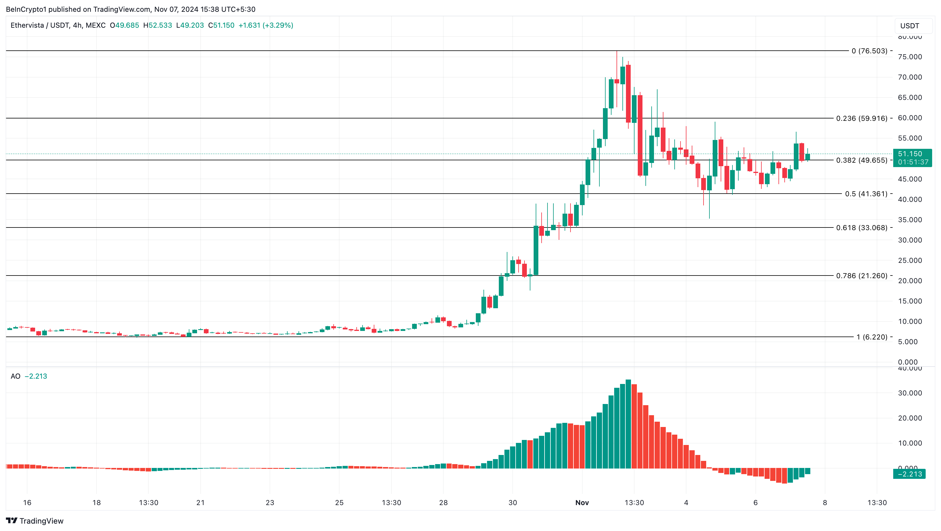 VISTAの価格が51ドル15セントで、AOが正の領域に戻る可能性がある場合、アルトコインは59ドル92セントに跳ね上がるかもしれません。非常に強気なシナリオでは、トークンの価値は76ドル50セントに跳ね上がるかもしれません。