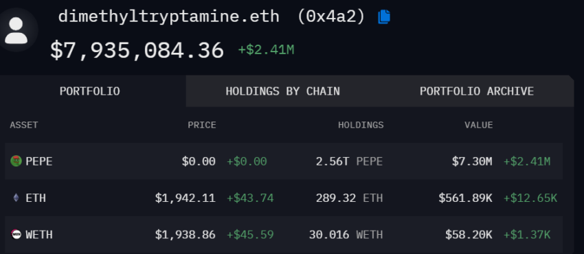 ぺぺコイン投資で億万長者となった典型例はdimethyltryptamine.ethという匿名トレーダーで、数週間前に260ドルで5.9兆枚のぺぺコインを取得した。同氏は現在、保有資産の約56%を売却して400万ドル以上の利益を得たにもかかわらず、アドレスにはまだぺぺコインが2兆5600億枚(約700万ドル相当)残されている。