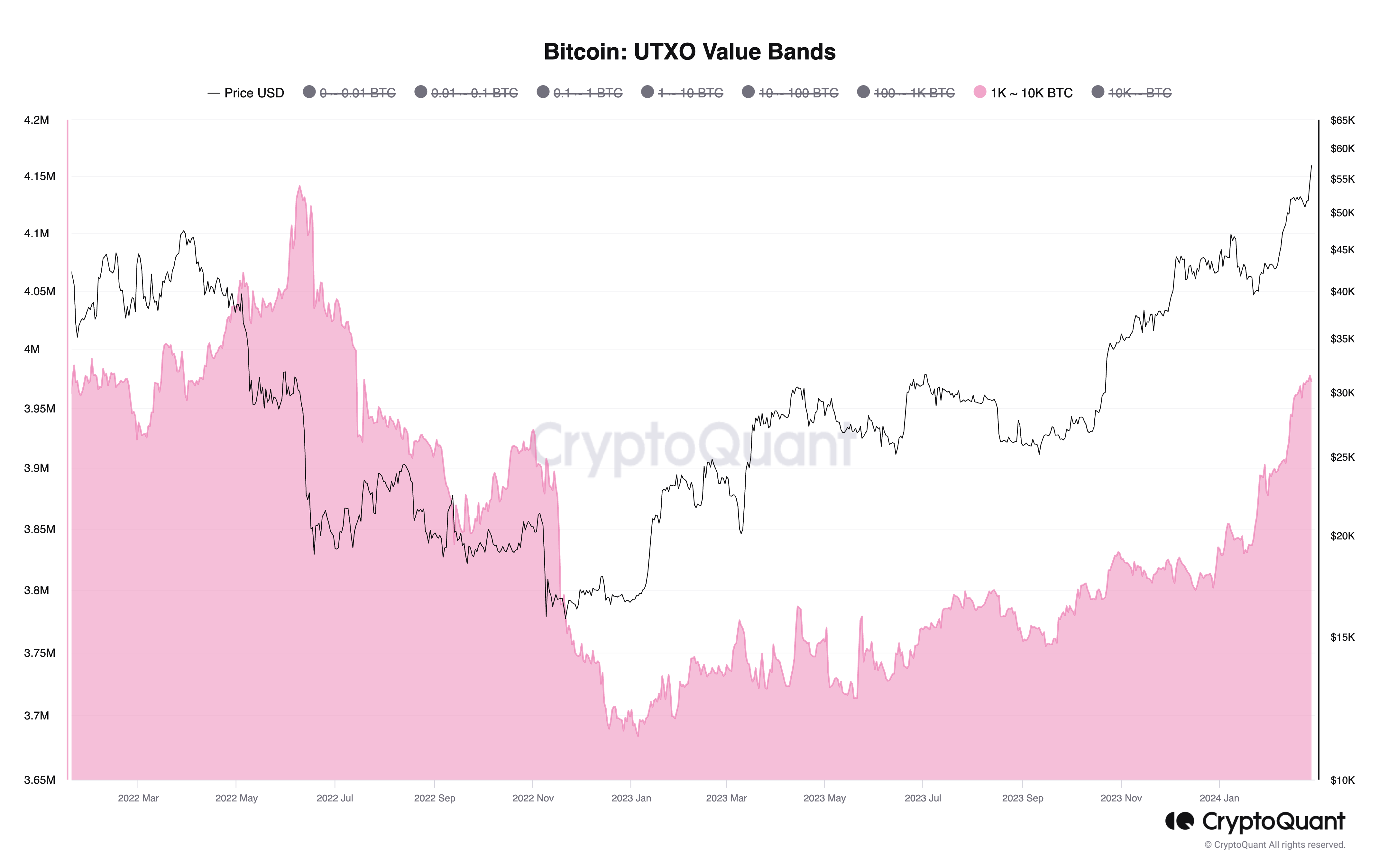 “大口事業体のビットコイン保有高は2022年7月以来の高水準に拡大し、合計397万5,000ビットコインとなった。2022年12月の369.4万ビットコインを底に着実に増加している。CryptoQuantのアナリストはBeInCryptoに対し、「大規模な事業体(1,000~10,000ビットコイン)が保有量を拡大することは、投資目的でのビットコイン需要の増加を示すため、価格上昇と相関関係がある」と述べた。