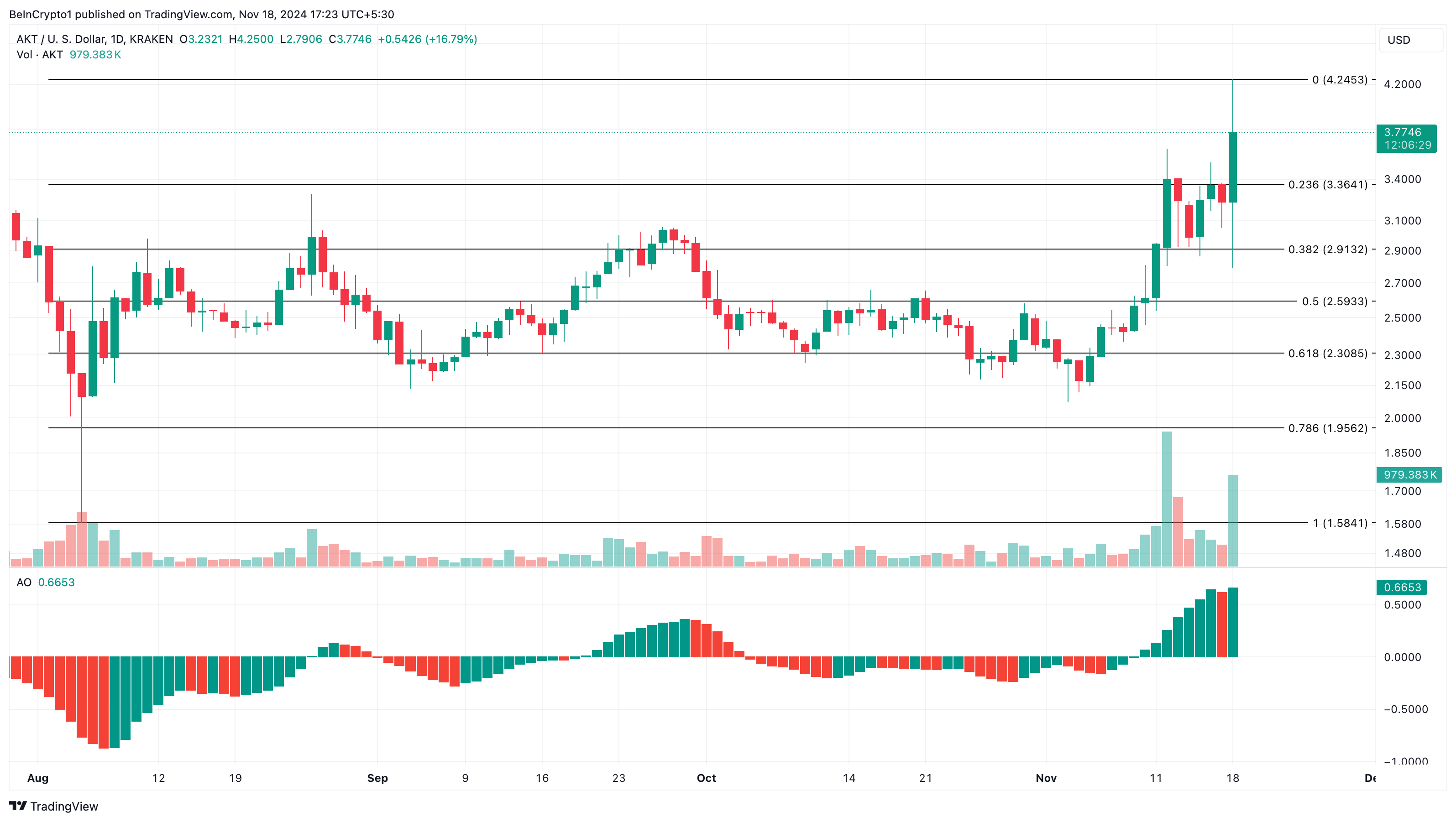 この開発に続いて、AKTの価格は4.25ドルまで上昇し、執筆時点で3.73ドルに下落した。日足チャートでは、Awesome Oscillator(AO)の読みが増加している。Awesome Oscillator(AO)は、現在のデータと歴史的データを比較して市場の勢いを測定し、既存のトレンドを確認または挑戦し、トレンドが強気か弱気かを特定するのに役立つ。