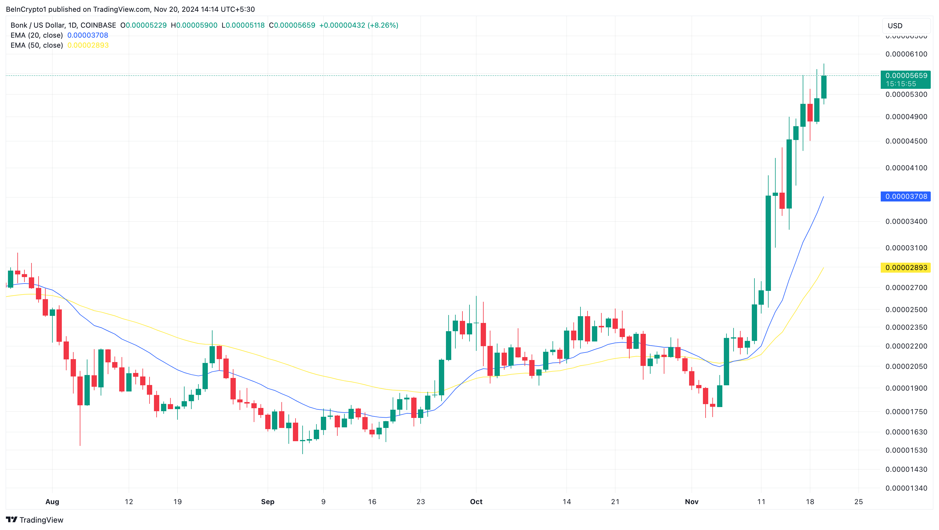 日足チャートでは、BONKの価格は主要な指数移動平均(EMA)を上回っている。以下に示すように、20日EMA(青)と50日EMA(黄)はアルトコインの価値を下回っている。
