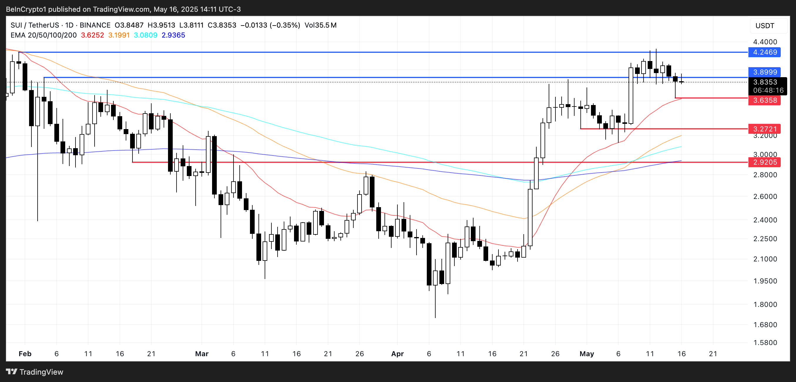 一方、SUIが3.63ドルのサポートを維持できない場合、次のターゲットは3.27ドル、さらには売り圧力が続く場合は2.92ドルとなる可能性がある。