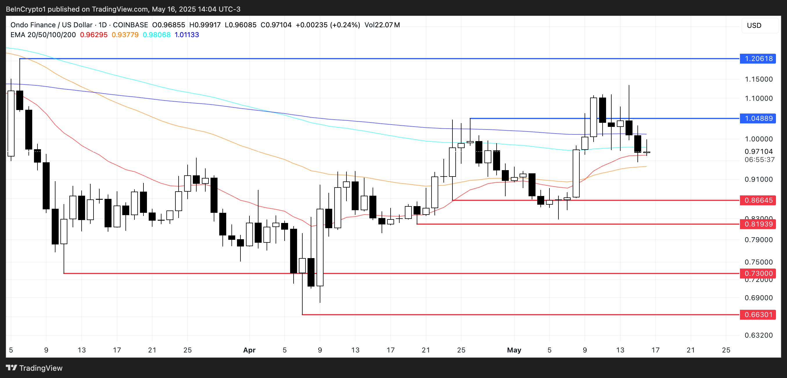 今後、上昇傾向が戻れば、ONDOは1.04ドルの抵抗をテストする可能性がある。そのレベルを突破すれば、価格は1.20ドルに向かうかもしれない。