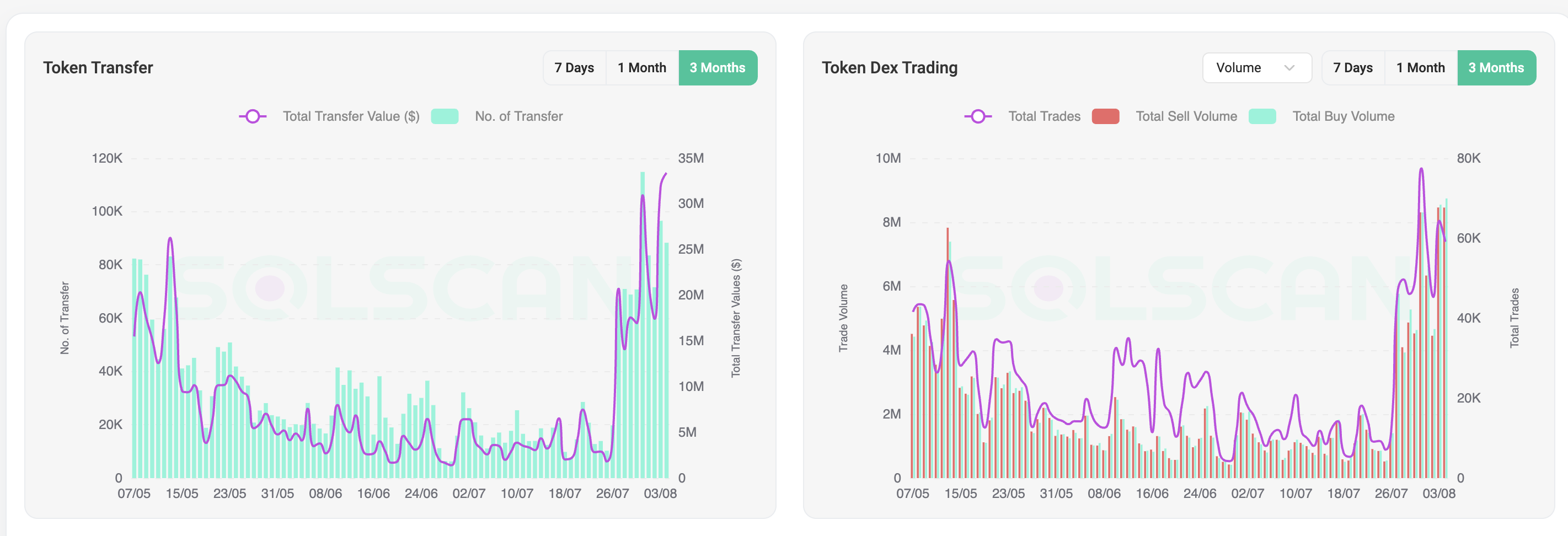 この価格上昇を裏付けるように、Solscanのデータからは取引活動の活発化が確認されている。分散型取引所(DEX)での取引量やトークンの移動量が過去最高水準に達し、投資家の関心が急速に高まっていることを示している。