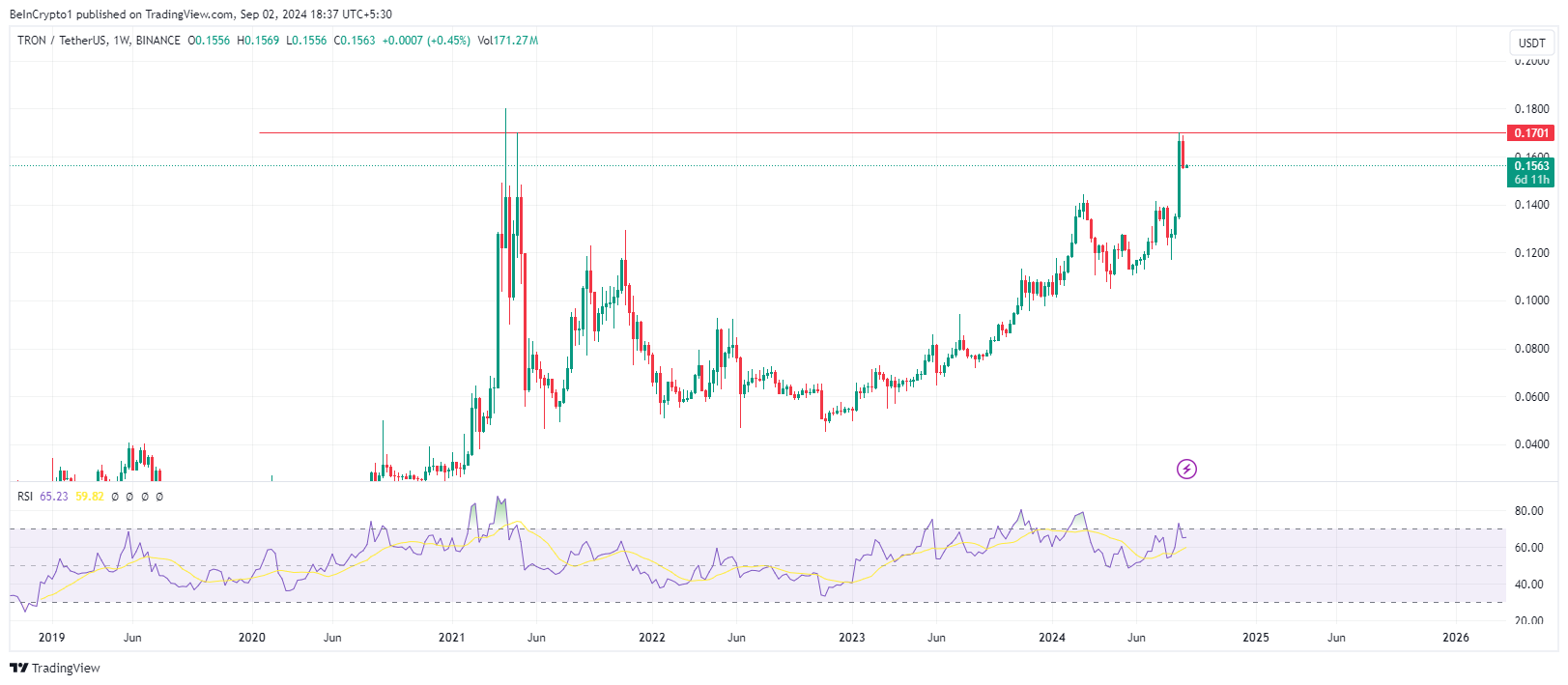 BeInCryptoのデータによると、TRXは本稿執筆時点で0.1565ドルで取引されており、月曜日のセッションが始まってから0.13%上昇しています。