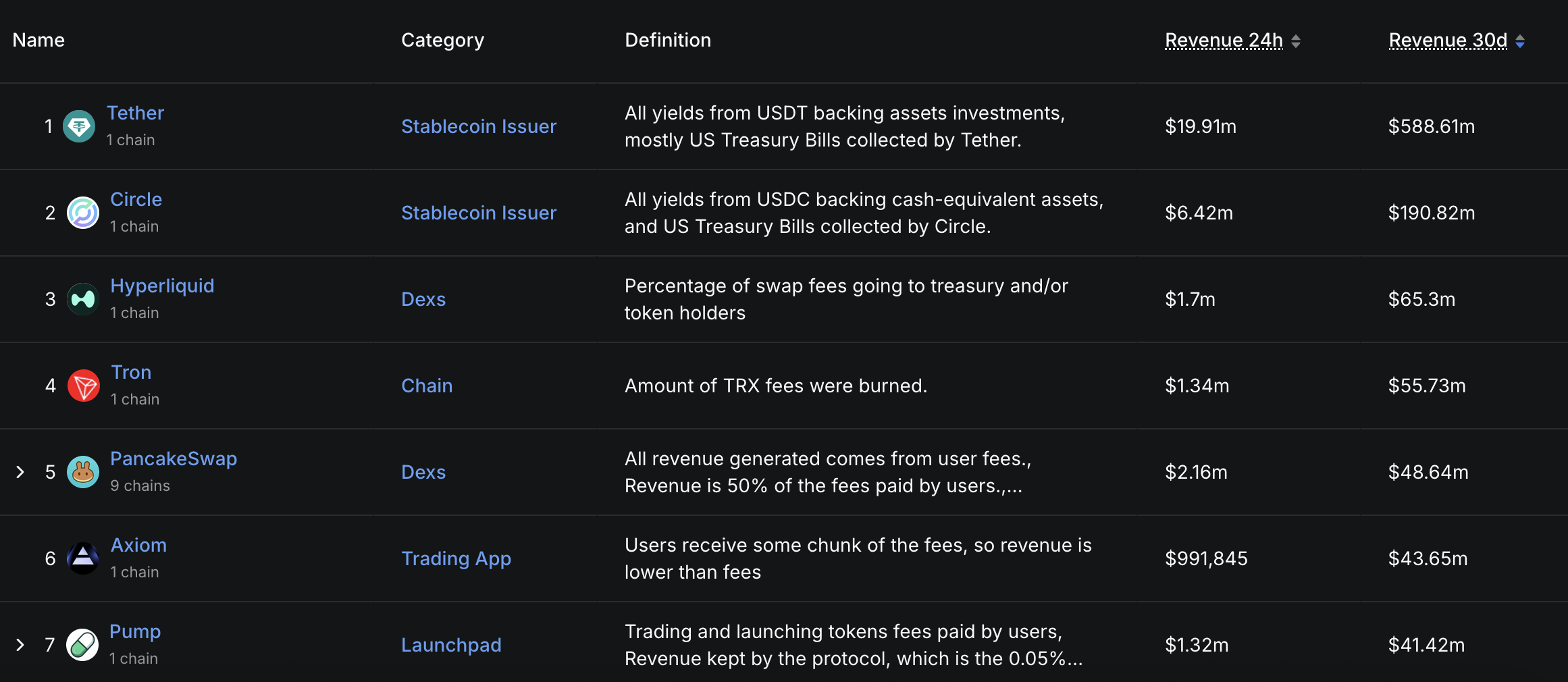 トロンは依然としてトップの収益を上げる暗号資産プラットフォームの一つであり、過去30日間で5570万ドルの収益を記録し、テザー、サークル、ハイパーリキッドに次ぐ順位に位置している。過去24時間だけで134万ドルの収益を上げた。