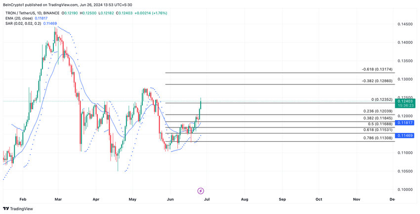 市場では買い圧力が持続しており、TRXは現在、大幅な強気センチメントに牽引されている。これは、コインのパラボリックストップ&リバース(SAR)インジケータを構成するドットの位置で確認できます。この記事を書いている時点では、これらのドットはTRXの価格の下に位置しています。