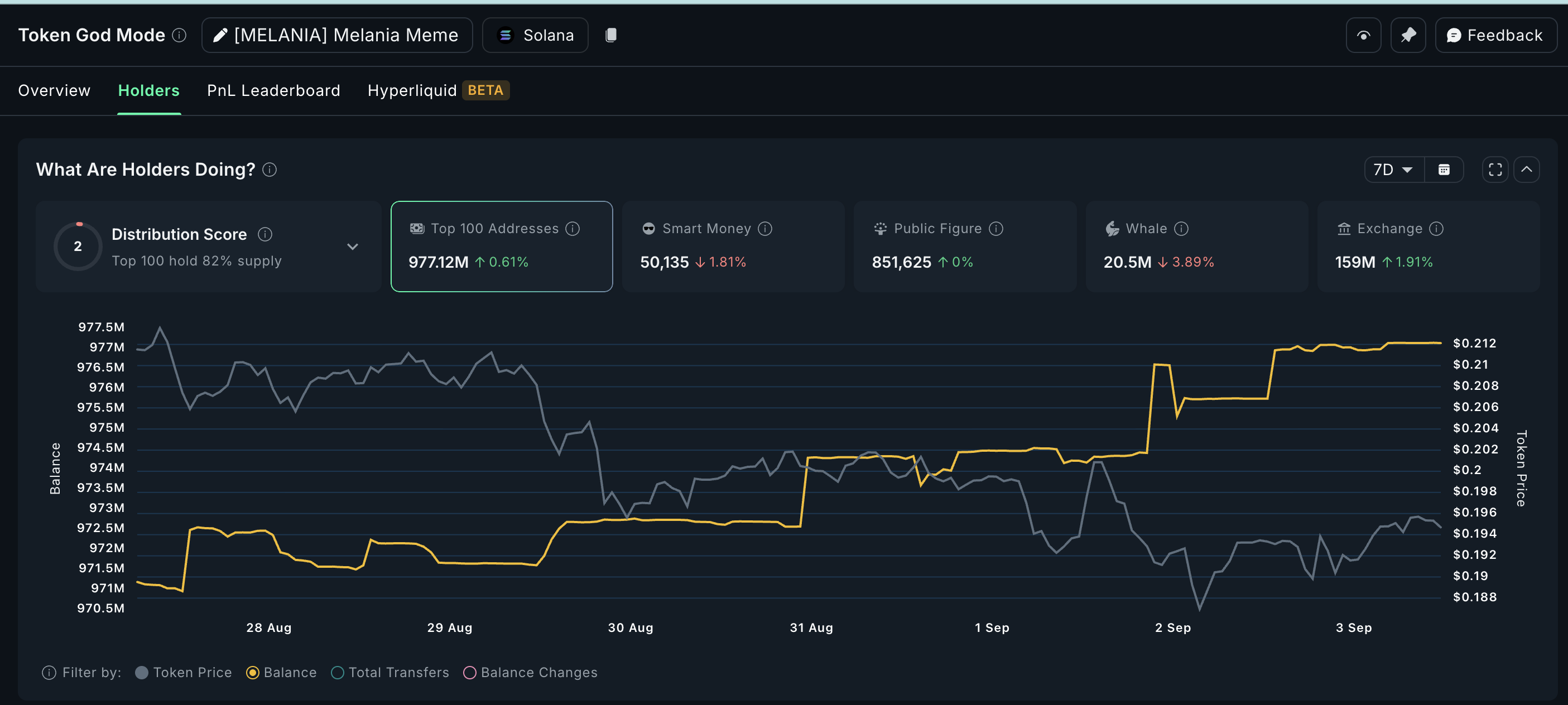 過去7日間の保有残高データはまちまちだ。上位100アドレスは約68万4,000トークンを積み増し、足元価格換算で約574万ドル。一方で、小規模クジラは約21万9,000トークン(約184万ドル)を売却し、取引所残高は51万2,000トークン(約430万ドル)減少している。