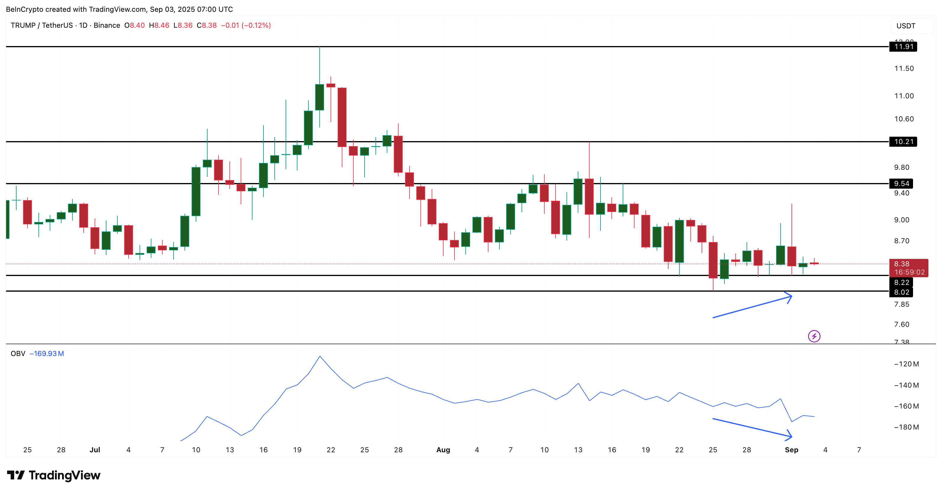 ウォレット残高とOBVの乖離は、上位100アドレスの積み増しが新規需要ではなく、アドレス間の再編成に過ぎない可能性を示唆する。その場合、弱気シグナルが優先される。TRUMP価格は8.22ドルのサポートを維持しており、圧力が強まれば次は8.02ドルが焦点。上方向は9.54ドルが初抵抗で、10.21ドルの回復が買い手優位回帰の条件となる。