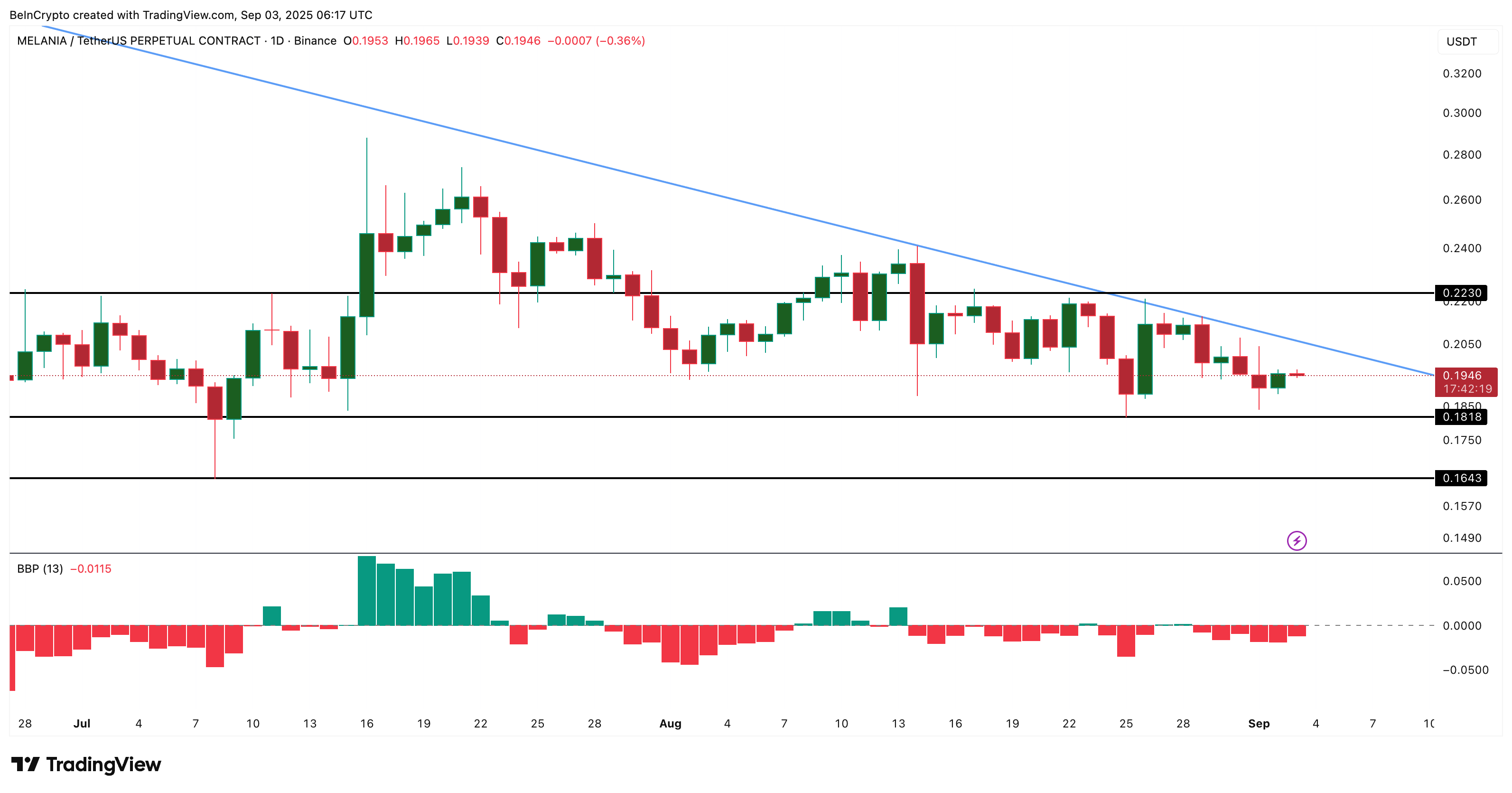 チャートも弱気基調を示す。MELANIAは下降三角形の中で推移し、高値は切り下がる一方で、下値サポートはフラットだ。価格は0.19ドル近辺で、注目ラインは0.18ドル。これを割り込むと0.16ドルが視野に入る。下降トレンドを転換するには、0.22ドルの上抜けが必要となる。