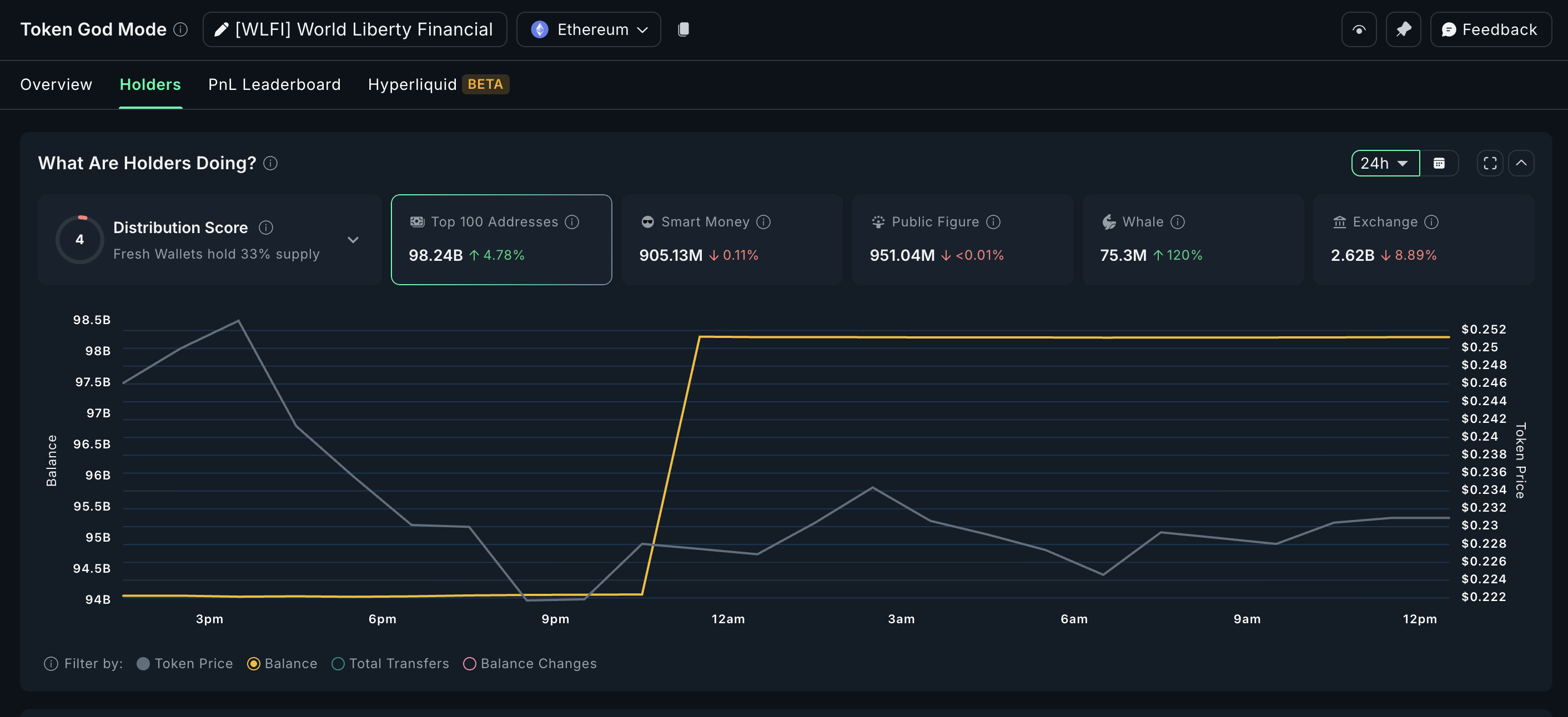 直近24時間データでは、大口の蓄積が確認できる。上位100アドレスは約47億8,000万トークンを追加し、足元価格0.22ドル換算で約10億9,000万ドル相当となる。