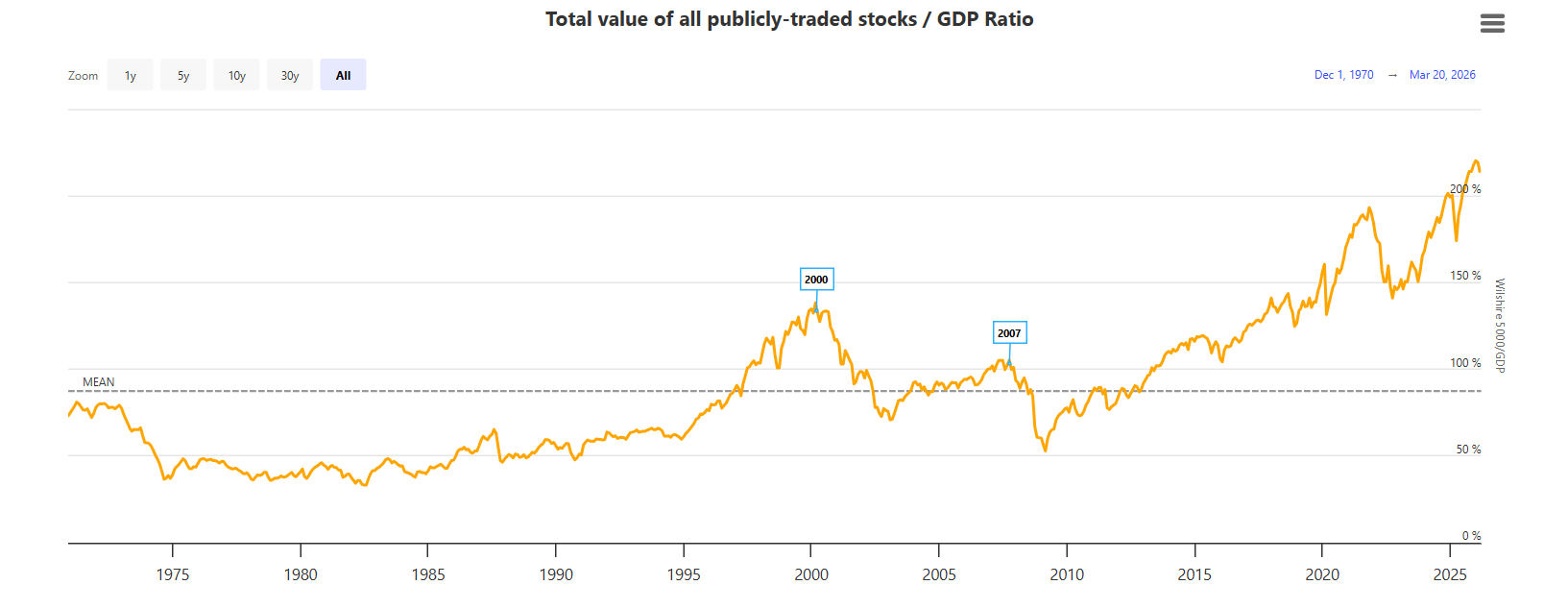 株式市場はこの危機を過去最高水準のバリュエーションで迎えた。シラーCAPEレシオは数十年ぶりの高水準。バフェット指標はGDP比約220%となり、ドットコムバブル期と同じレベルに達した。