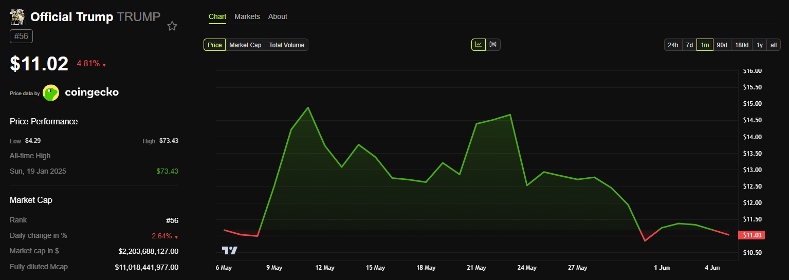 MELANIAミームコインと同様に、TRUMPも以前の過去最高値と比較して84%以上価値を失っている。本稿執筆時点での取引価格はわずか11.20ドル。