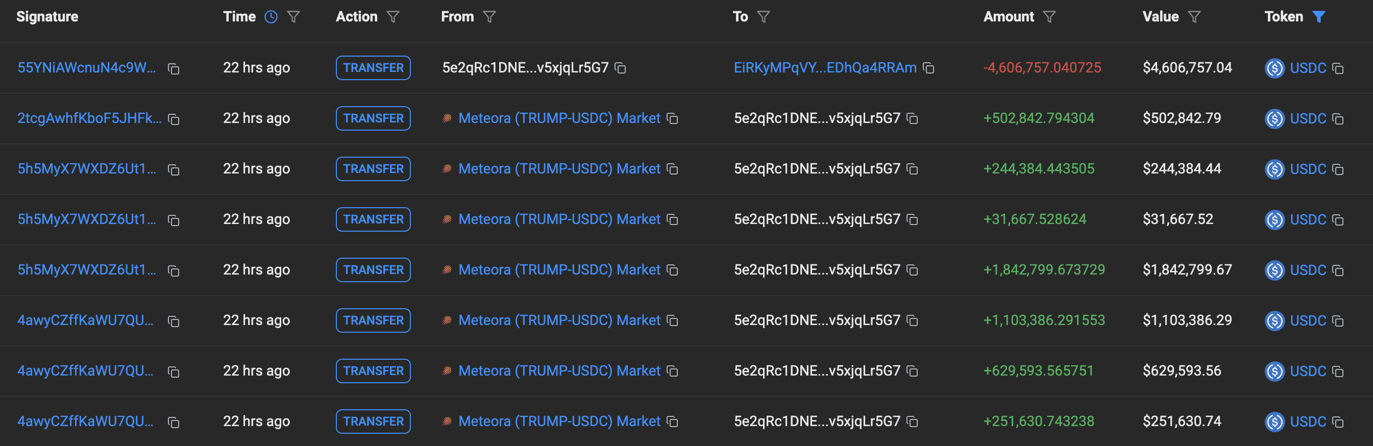 トランプ氏のミームコインに関連するウォレットは15日、ソラナDEXのMeteoraから460万ドルのUSDCを引き出した。