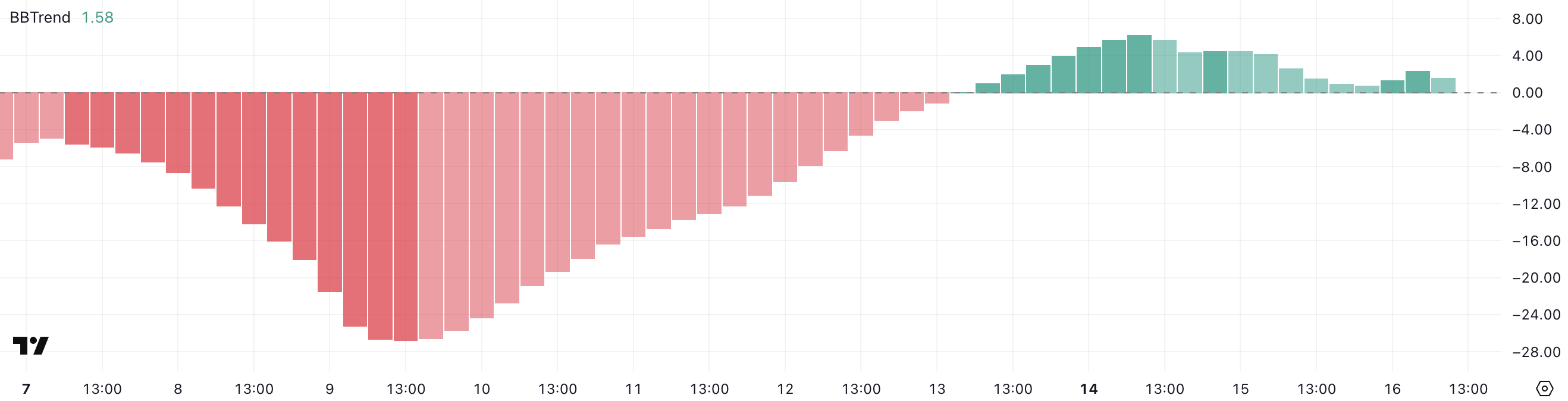 週の初めに強い勢いを示していたが、現在のBBTrendの読み取りは、買いの関心が薄れ続ける場合、統合または反転への移行を示唆している。