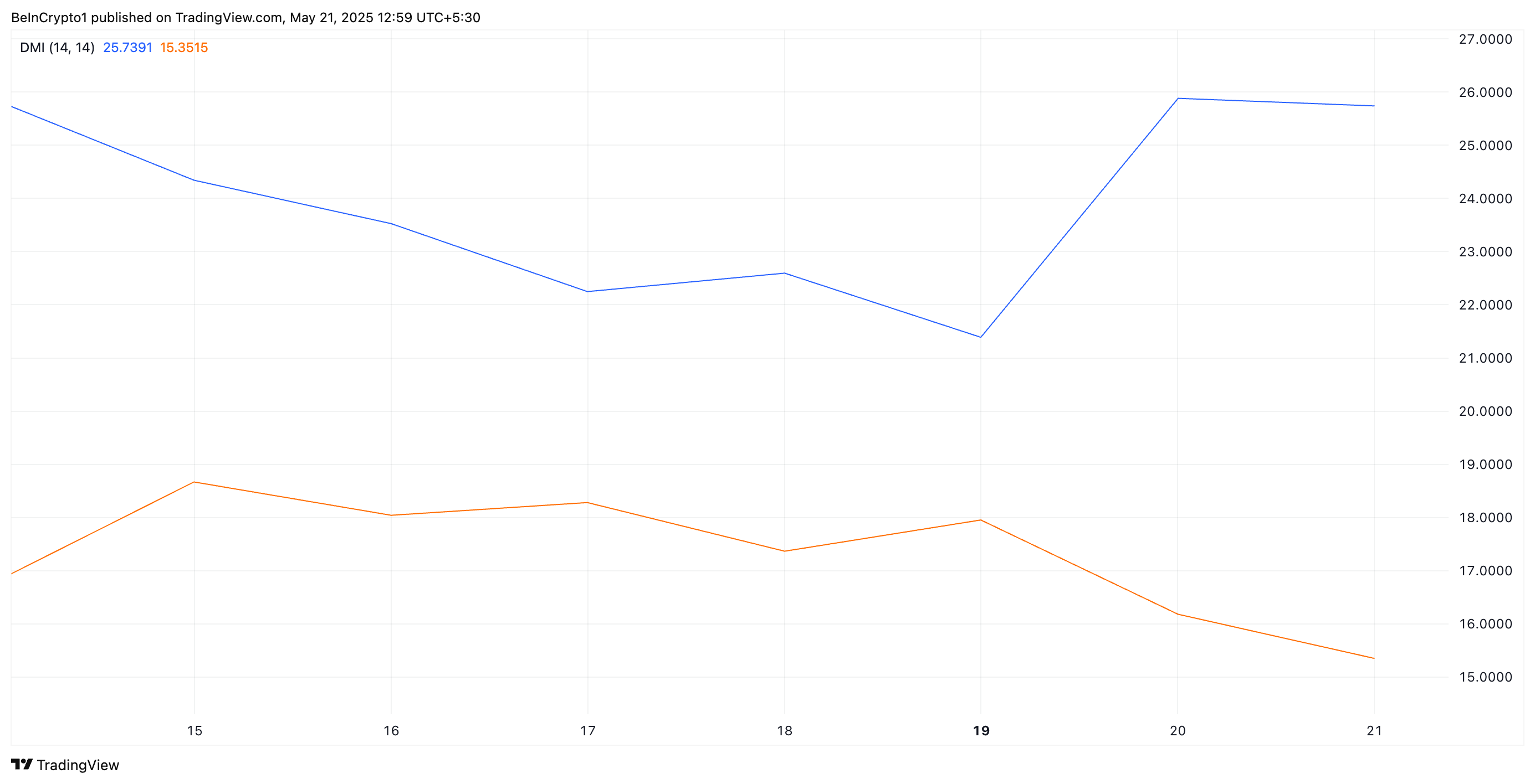 さらに、TRUMPの方向性移動指数(DMI)の読み取りも、スポット市場での買い活動を確認している。本稿執筆時点で、トークンのポジティブ方向指数(+DI、青)はネガティブ方向指数(-DI、オレンジ)を上回り、ギャップが広がっている。