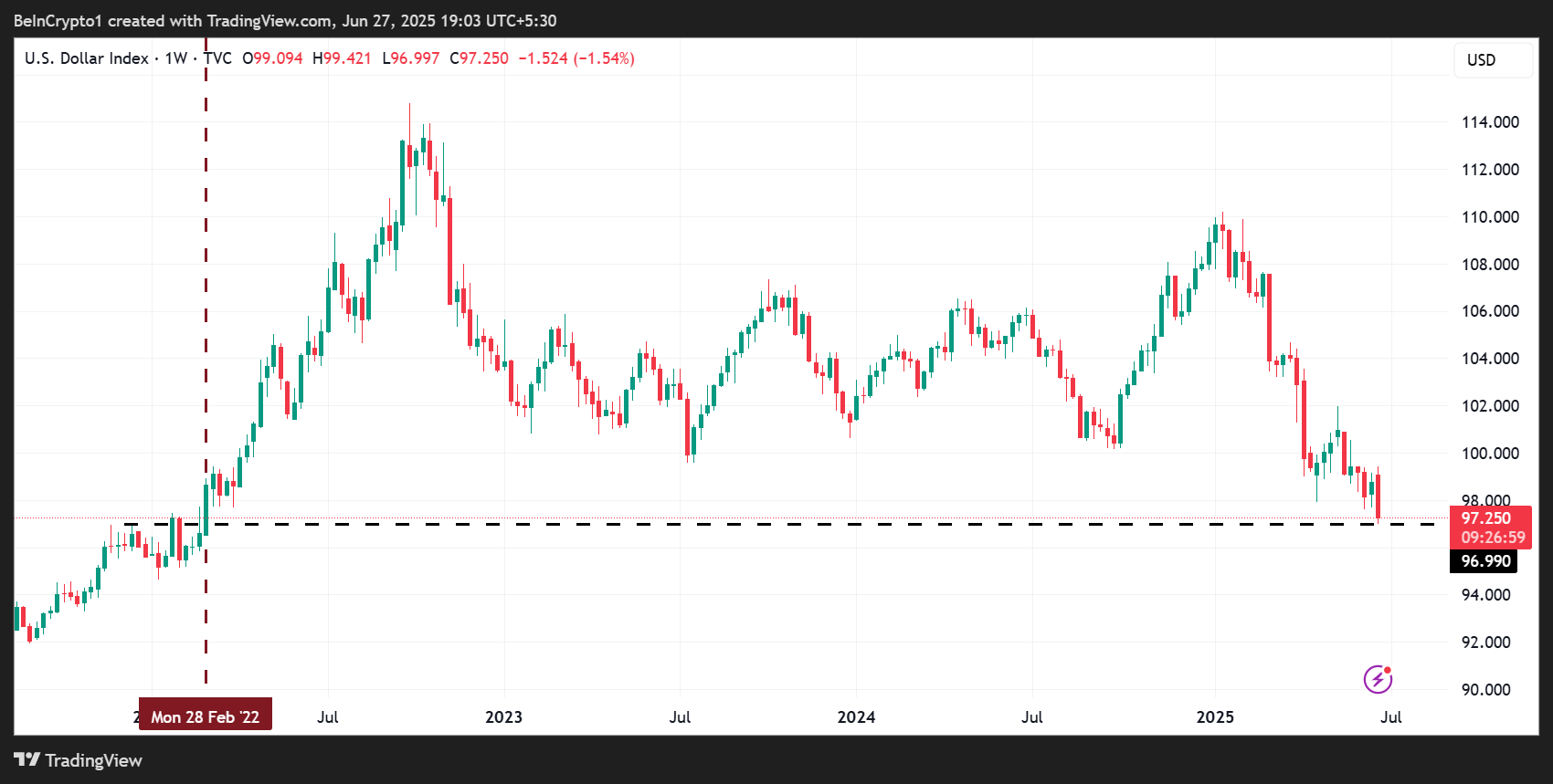 このニュースに反応して、米ドル指数(DXY)は下落傾向にあり、2022年以来の水準に戻っている。