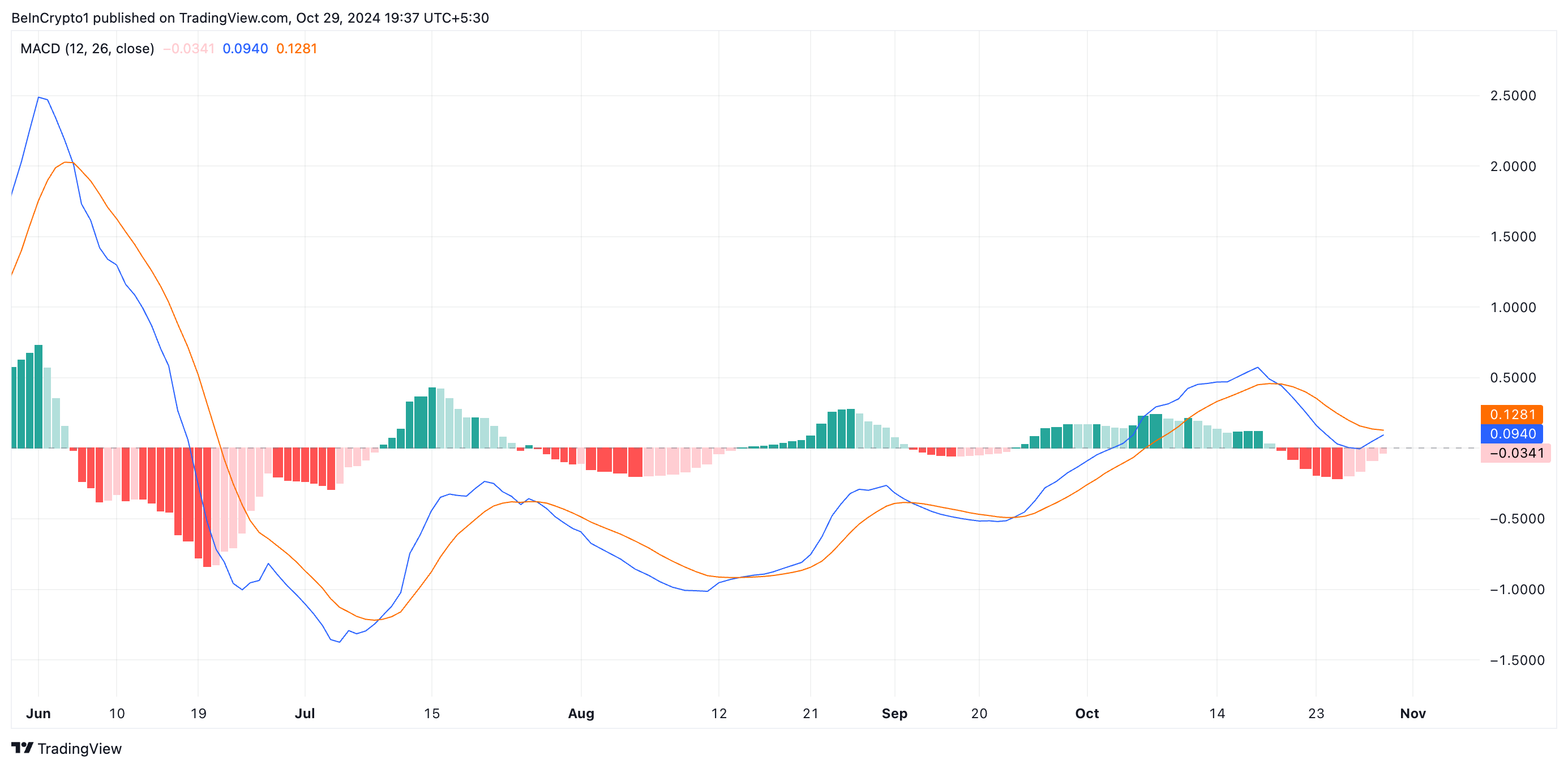 さらに、TRUMPの移動平均収束発散(MACD)からの読み取りもこの強気の見通しを確認する。執筆時点で、MACD線(青)はシグナル線(オレンジ)を上回る強気のクロスオーバーを開始する準備ができている。