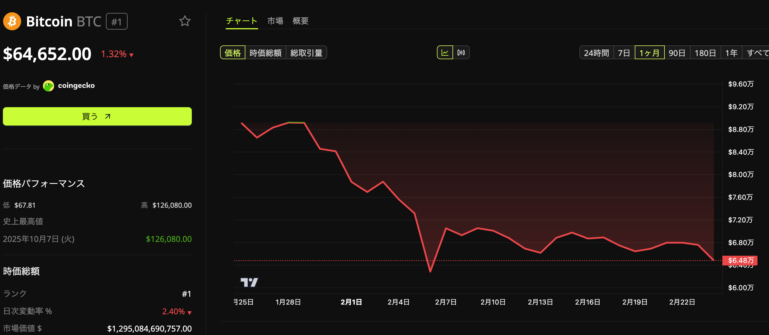 ビットコインはアジア時間帯に6万7,700ドル近辺から急落を開始し、一時約6万4,300ドルの安値を記録。その後6万5,900ドル超まで値を戻したものの、米国市場の取引時間中は再び上値が重い展開となった。Bloombergのデータによると、同日の下落幅は一時4.8%に達し、2月6日以来の安値圏となった。