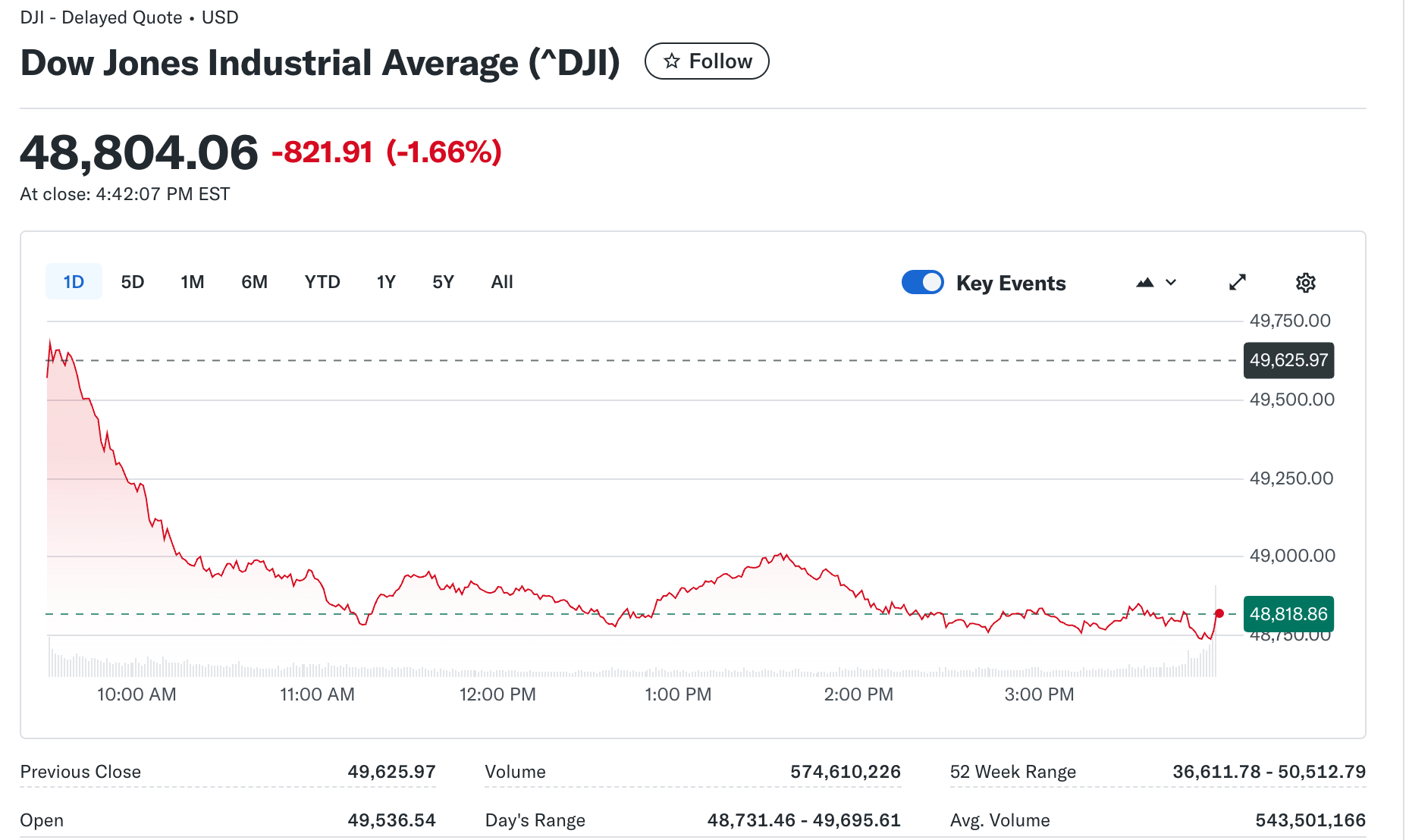 週明けの米株式市場でダウ平均は前週末比821.91ドル安の4万8,804.06ドルで引け、ハイテク株中心のナスダック総合指数も258.80ポイント安の2万2,627.27と大幅に下落した。