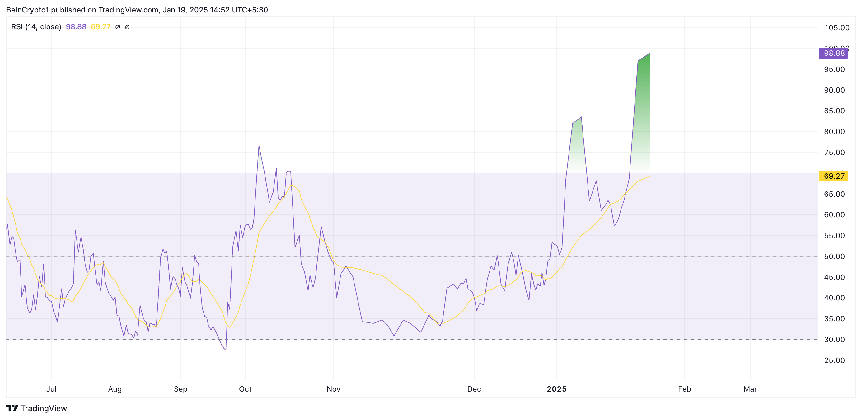 TRUMPの技術指標は、ミームコインが現在買われ過ぎであることを示しており、差し迫った修正の懸念を引き起こしています。例えば、執筆時点での相対力指数(RSI)は98.88であり、TRUMPへの爆発的な需要を示しています。