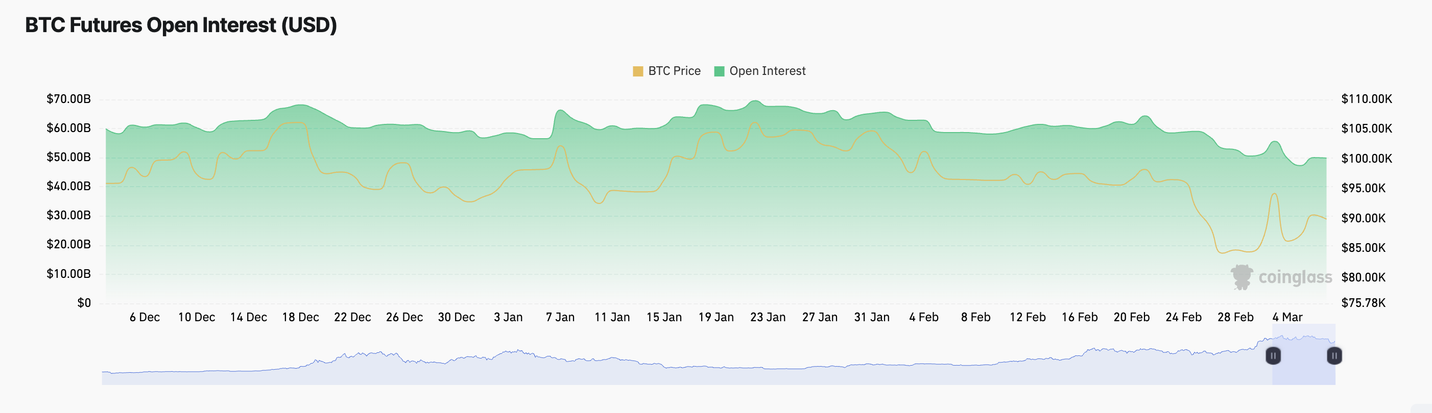 Sponsoredさらに、BTCのオープンインタレストは減少しており、トランプの大統領令以来の取引活動の減少を示している。本稿執筆時点で500億ドルであり、過去24時間で5%急落している。