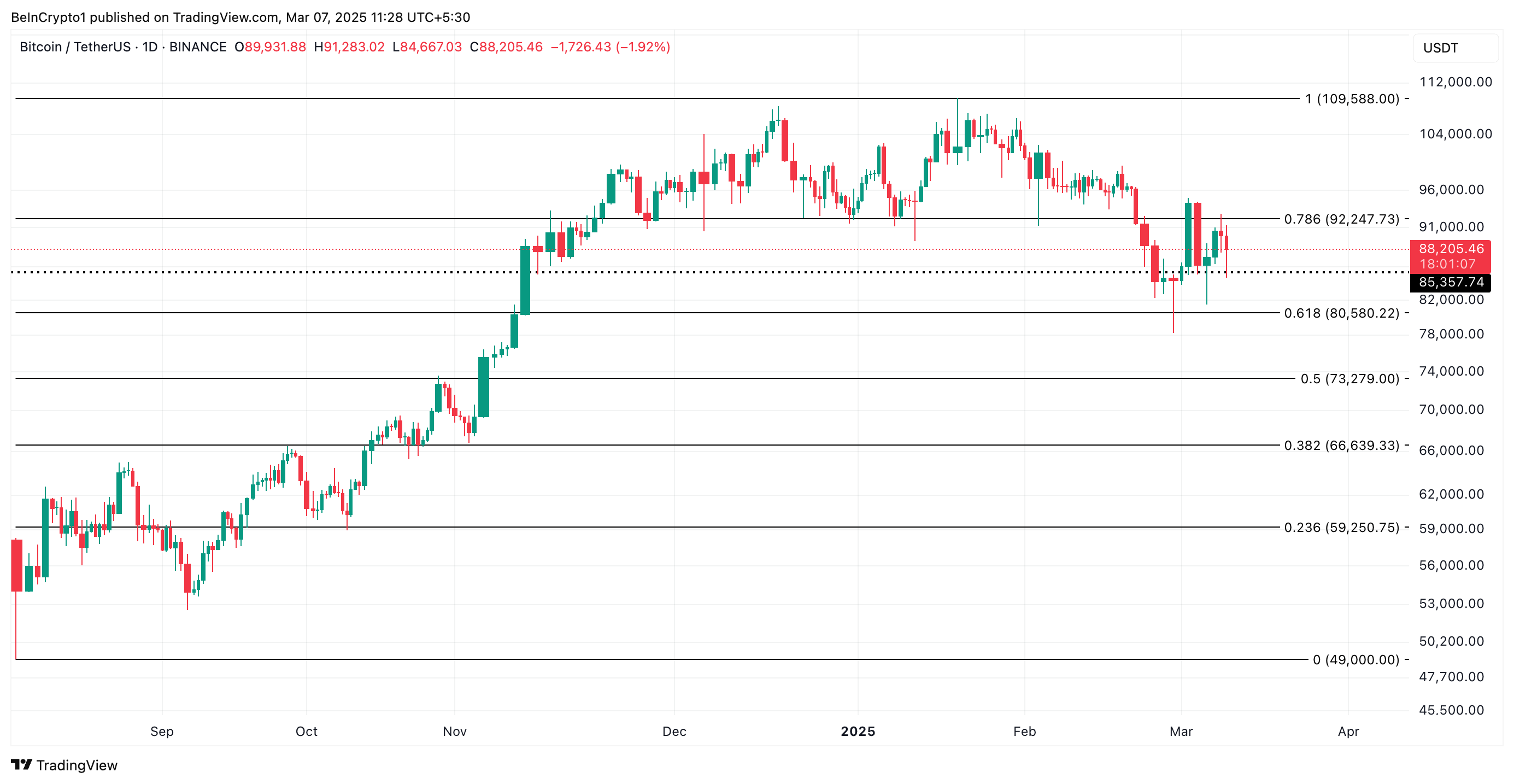 BTCの下落は、今日後に予定されている暗号資産サミットの数時間前に発生した。需要が停滞し、下落傾向が続く場合、コインの価格は再び85357ドルで形成されたサポートを再テストする可能性がある。