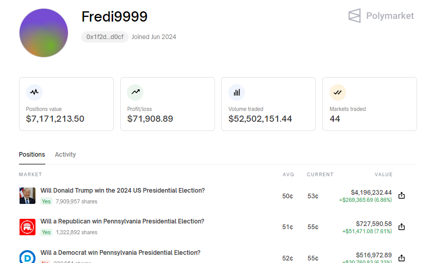 特に、Fredi9999というアカウント名のPolymarketユーザーが注目されています。Polymarketのデータによると、このユーザーはプラットフォームで最大の保有者であり、トランプ株で最大790万を保有しています。Frediはさらに717万ドルのポジション価値を持ち、さらに多くの資本を投入する準備ができています。