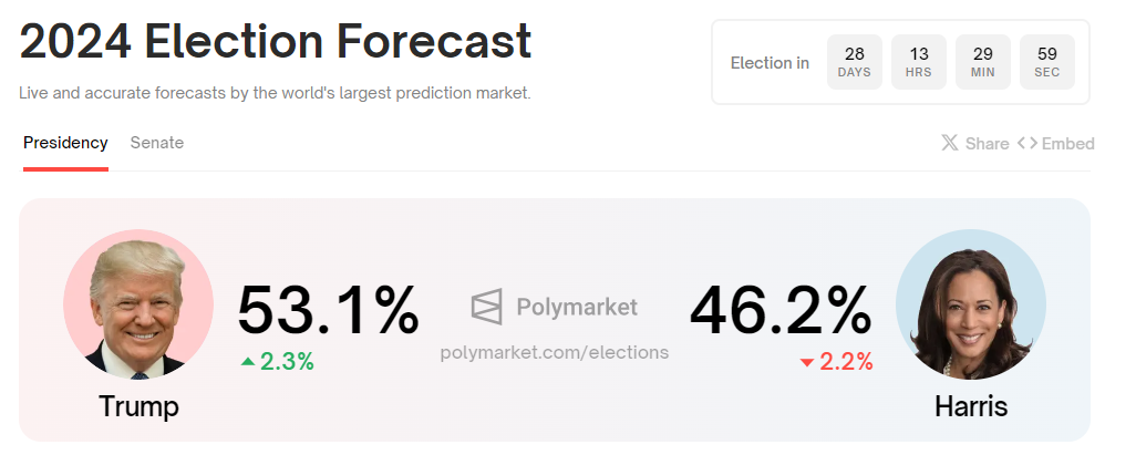 ドナルド・トランプ氏がPolymarketでリードを広げ、カマラ・ハリス氏との差を広げています。米大統領選挙まであと28日で、共和党の候補者は53.1%で民主党の46.2%に対してリードしています。