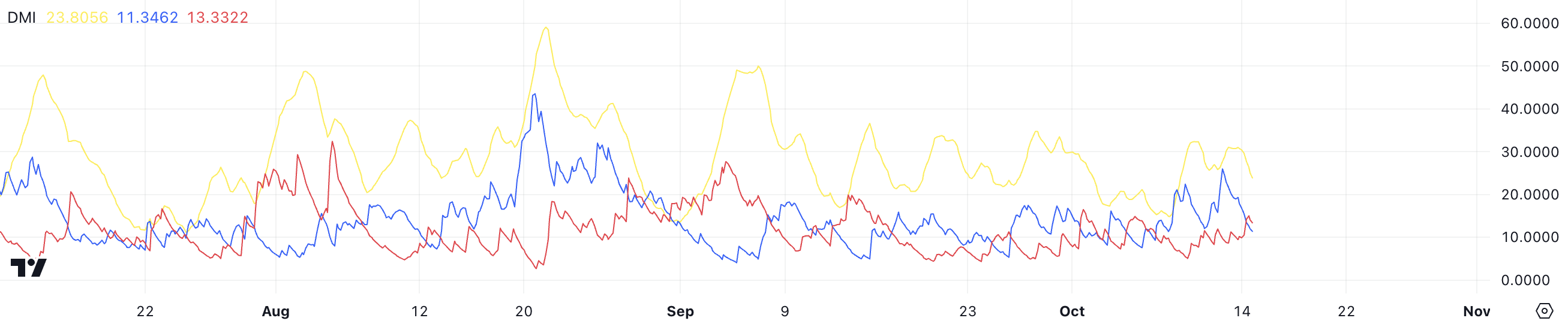 青線(+DI)は、肯定的な価格動向の強さを測定し、この時点で11.3と比較的弱い買い圧力を示している。一方、赤線(-DI)は13.3でやや高く、現在の買い圧力よりも売り圧力が優勢であることを示唆しているが、大きな差ではない。