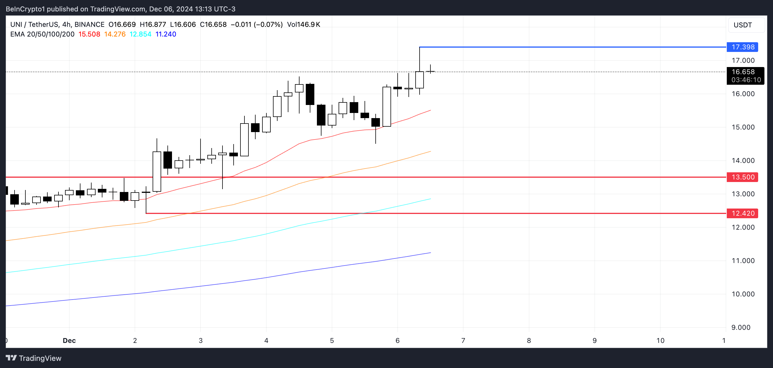 上昇トレンドが続く場合、UNIの価格は17.39ドルの抵抗を試し、2021年以来の最高価格である20ドルに達する可能性がある。
