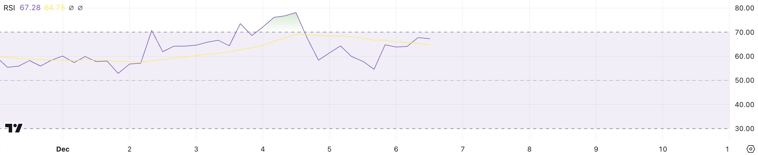 UniswapのRSIは現在67であり、買われ過ぎの領域に近づいているが、まだ70のマークには達していない。